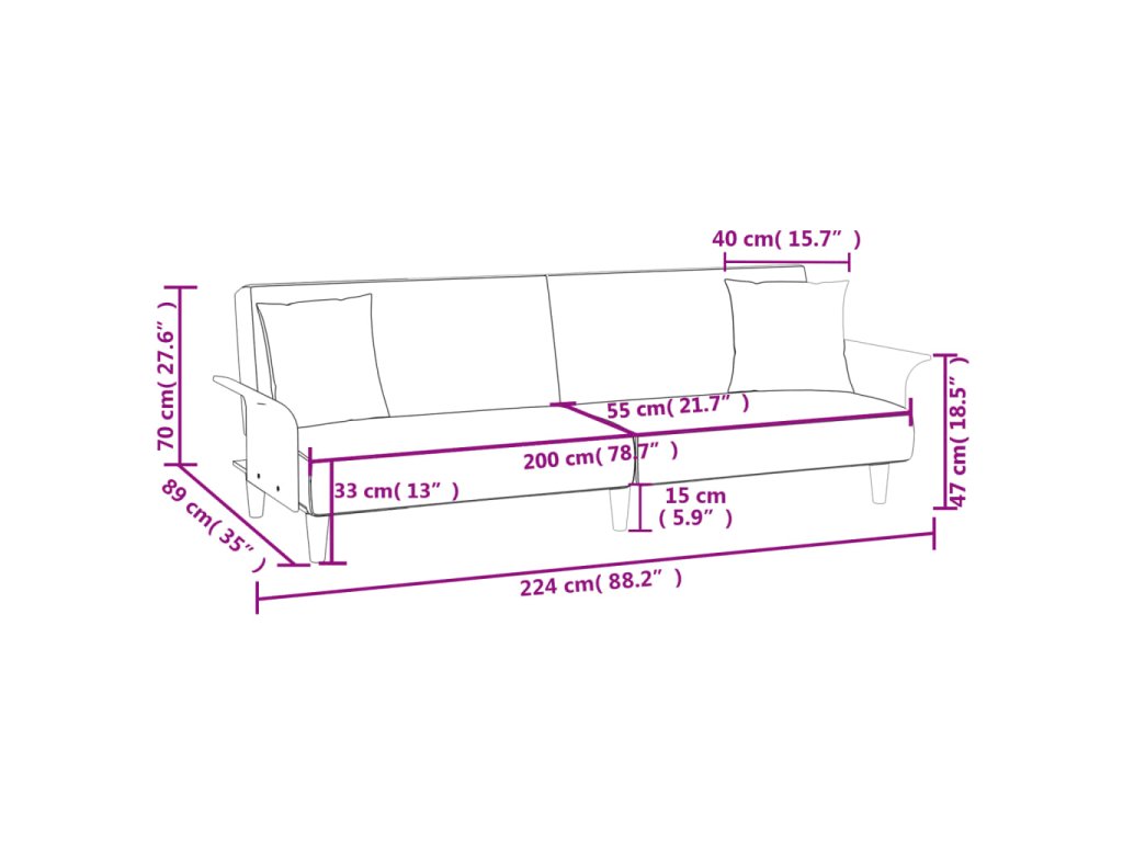 - Celkové rozměry (při úplném rozložení): 224 x 100 x 47 cm (Š x H x V)