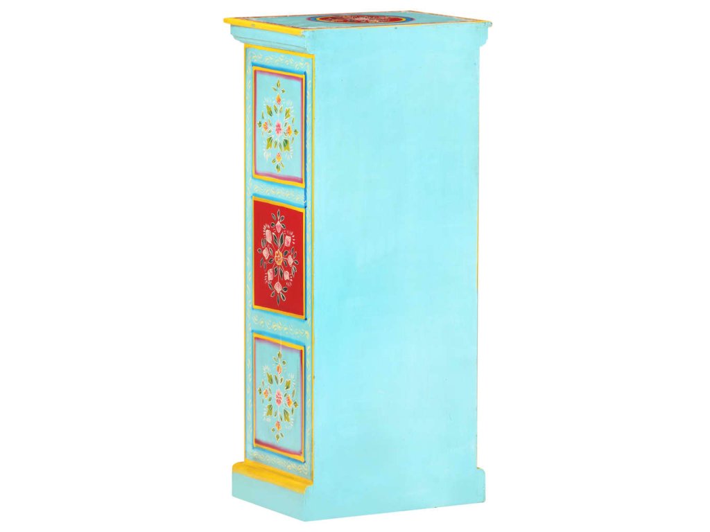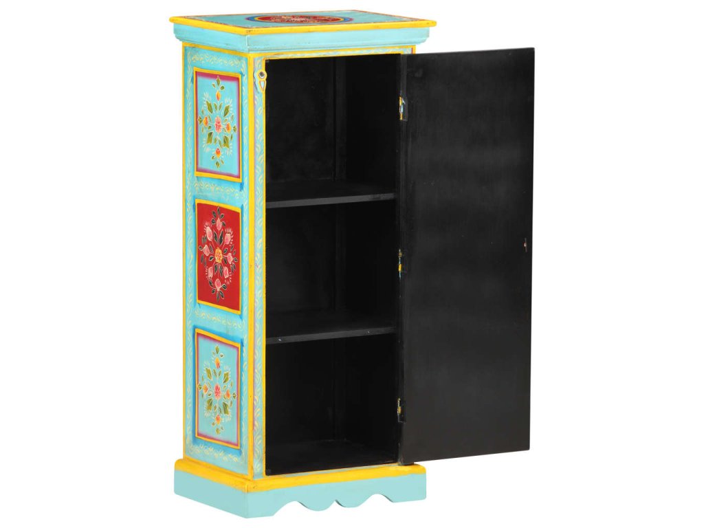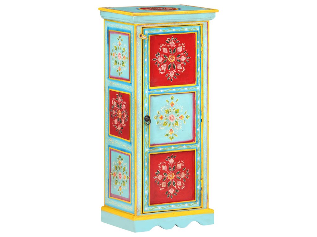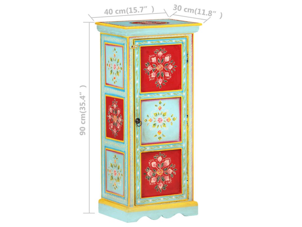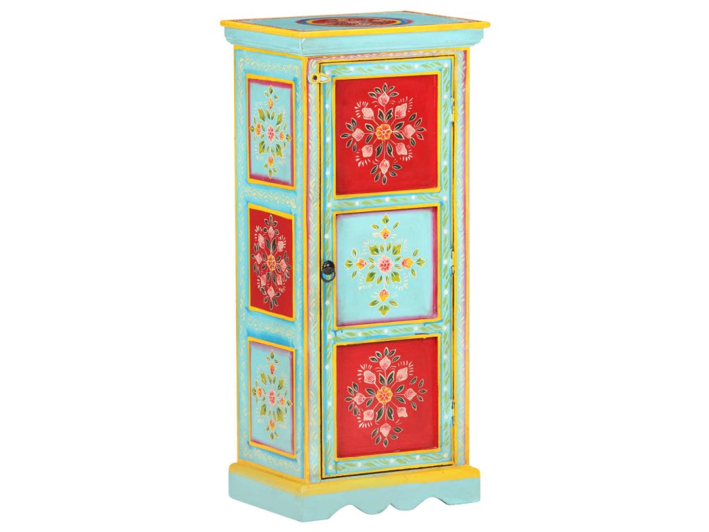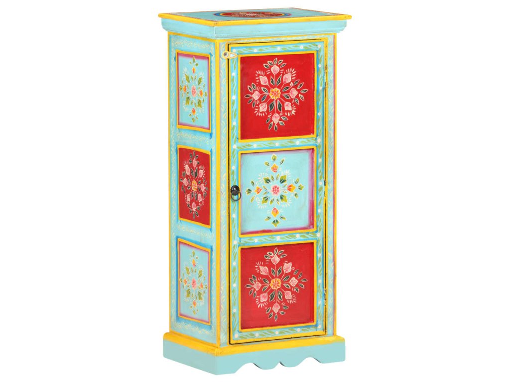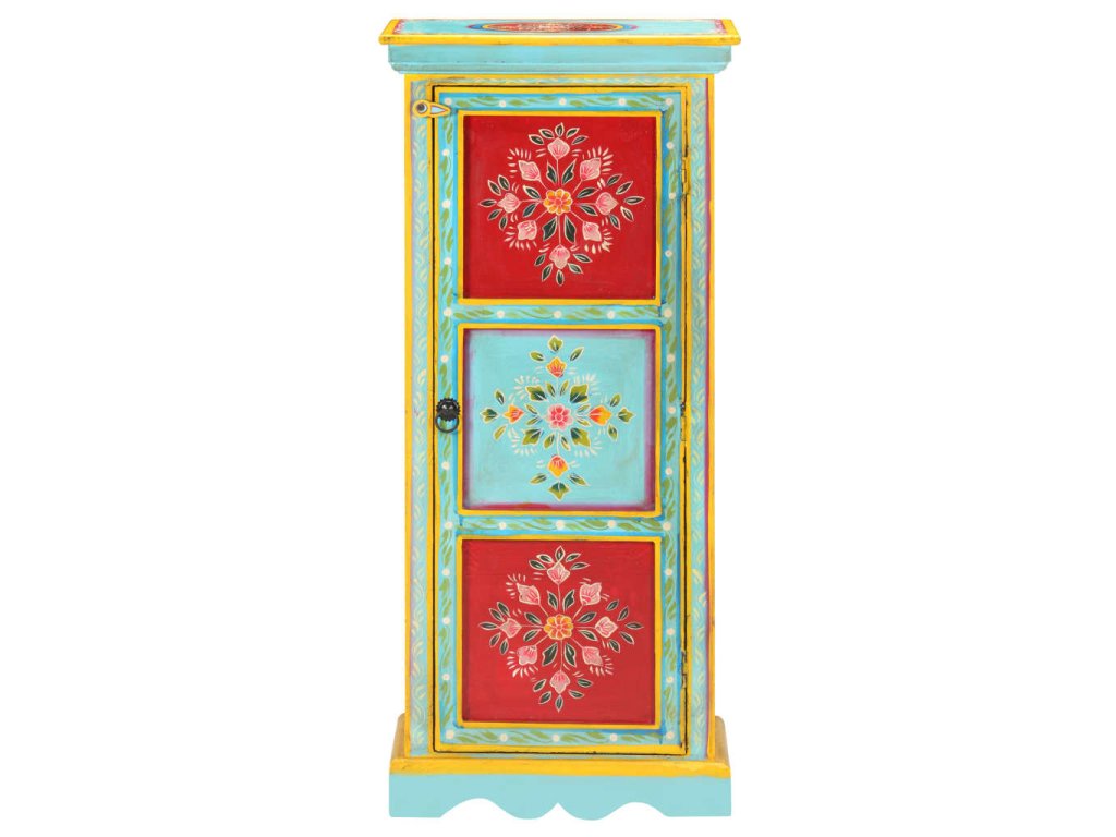 Tato úložná skříňka vyniká ručně malovanými bohatými detaily, které vyzařují eleganci a výrazný rafinovaný vzhled. V komodě jsou 3 police, které poskytují dostatek prostoru pro uložení vašich osobních věcí, jako jsou knihy, časopisy a další nezbytné věci. Tato odkládací skříňka je vyrobená z masivního mangovníku, tropického tvrdého dřeva. Má velkou nosnost a také výborně vzdoruje zubu času. Vynikající řemeslné zpracování každému kusu vtisklo jedinečný a od ostatních mírně odlišný charakter. Tato pestrobarevná komoda je dekorativní i praktický doplněk do vašeho bydlení!