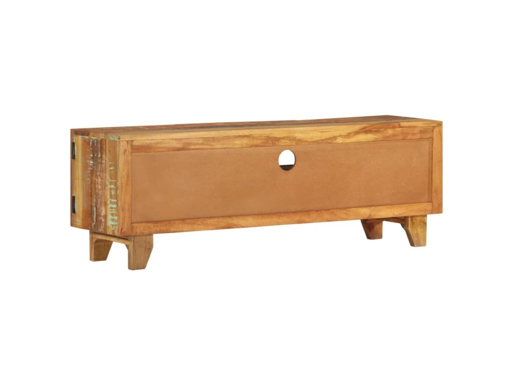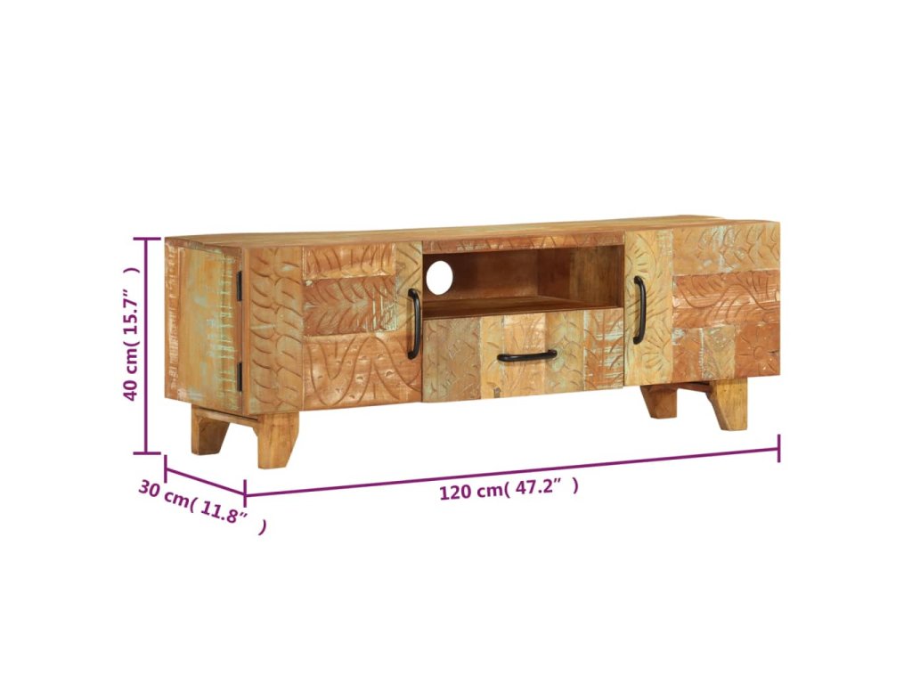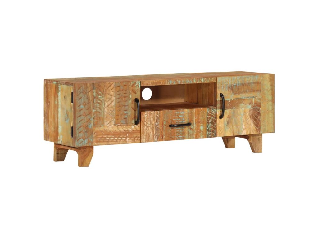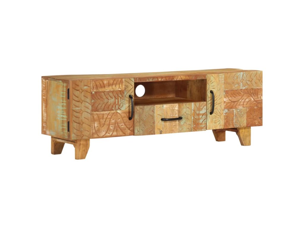 Pestrobarevný stolek na multimediální zařízení se starožitným vyřezávaným zdobením je vyrobený z masivního recyklovaného dřeva, které pochází z trámů, podlah a podpěrných nosníků ze starých budov určených k demolici. Obsahuje tedy celou řadu různých druhů dřeva, jako jsou borovice, teak, buk, dub, cedr, mangovník, akácie atd. Recyklované dřevo tak nabývá vlastností všech těchto rozličných typů dřevin. Navíc je již zestárlé, zvětralé a vyschlé, takže se nesmršťuje ani neohýbá. Každá fáze výrobního procesu je prováděná s mimořádnou péčí, ať už se jedná o natírání, leštění nebo lakování. Prvotřídní řemeslné zpracování a elegantní kresba dřeva činí každý kus nábytku jedinečným a lehce odlišným od ostatních. Ve vintage televizním stolku najdete 2 dvířka, 1 zásuvku a 1 přihrádku, které představují ideální řešení k uspořádání menších předmětů, které chcete mít dobře uložené a zároveň po ruce. Sestavení TV stolku je jednoduché.
