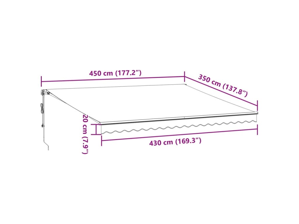 - LED světla: Integrovaná LED světla markýzy osvětlí váš venkovní obytný prostor a vytvoří útulnou a romantickou atmosféru po západu slunce.