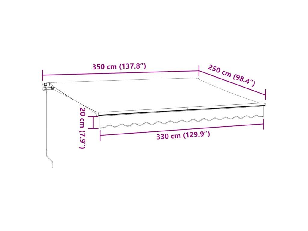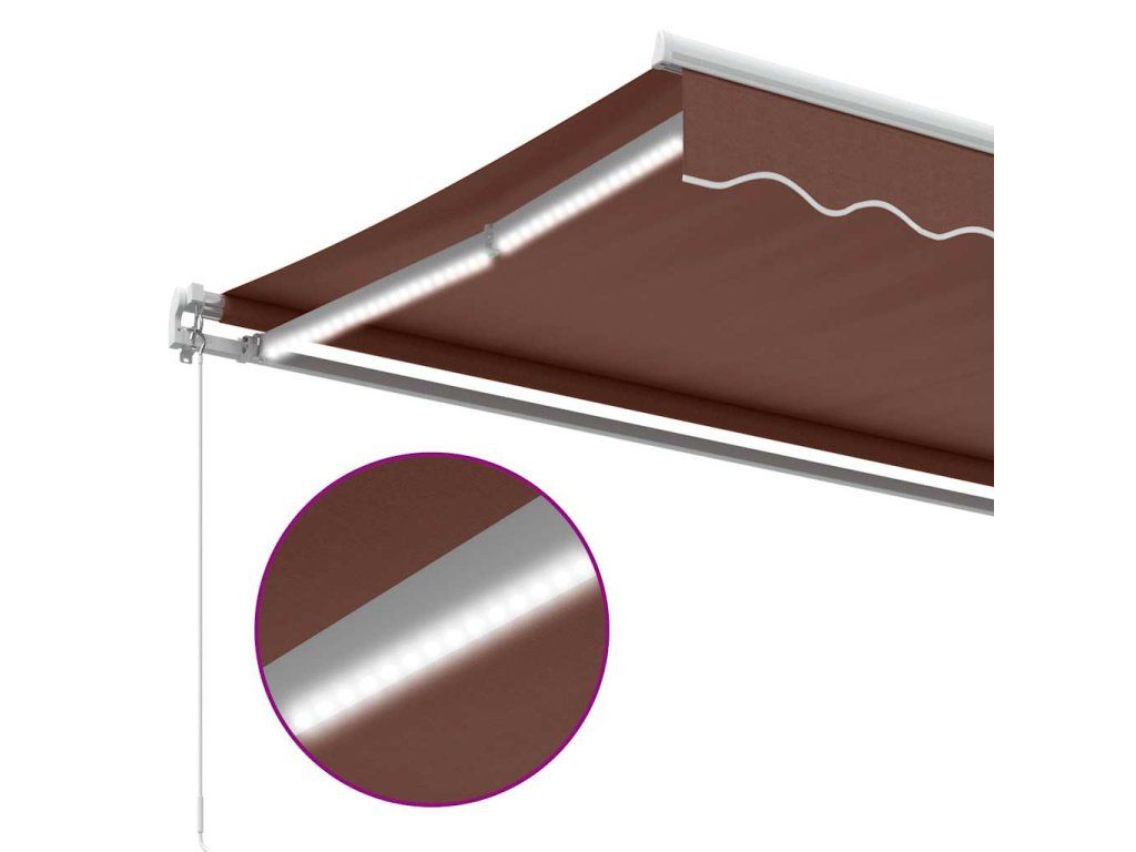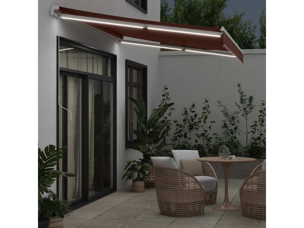 - LED světla: Integrovaná LED světla markýzy osvětlí váš venkovní obytný prostor a vytvoří útulnou a romantickou atmosféru po západu slunce.