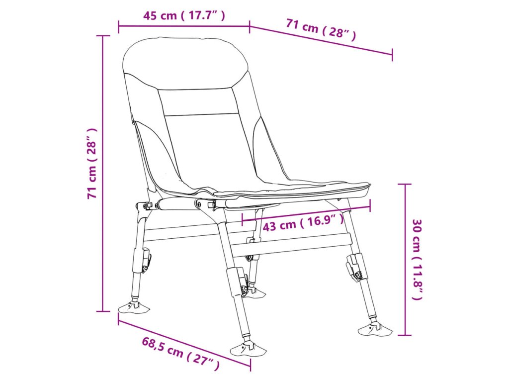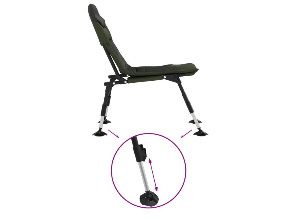 - Praktický design: Nastavitelné nohy rybářského křesla jsou opatřeny patkami do bláta, které zajišťují pohodlné používání i na nerovném terénu a zabraňují zaboření do měkkého povrchu.