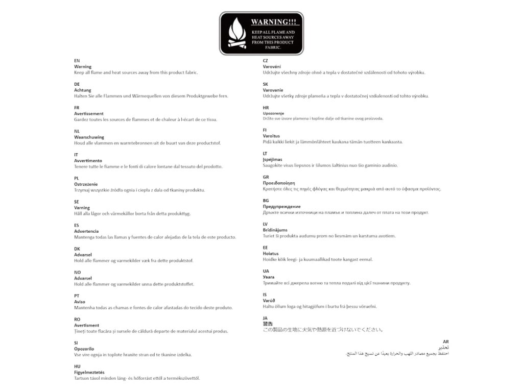 - Udržujte všechny zdroje plamene a tepla mimo tkaninu výrobku.