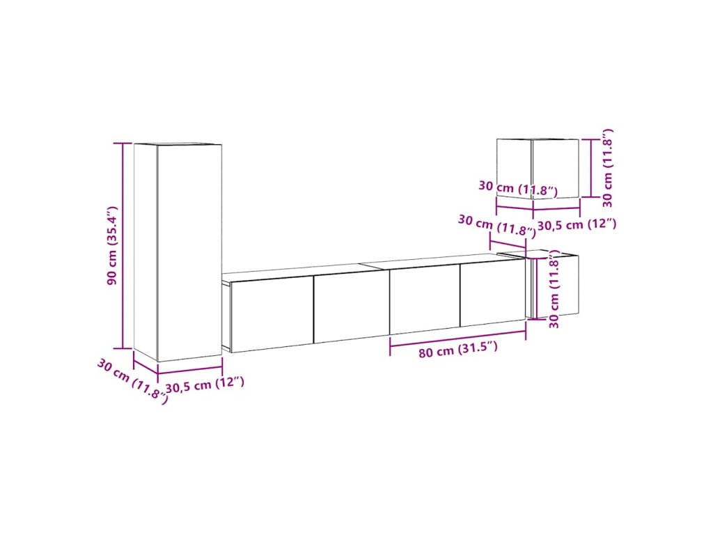 - 1x TV skříňka: 30,5 x 30 x 90 cm (Š x H x V)
