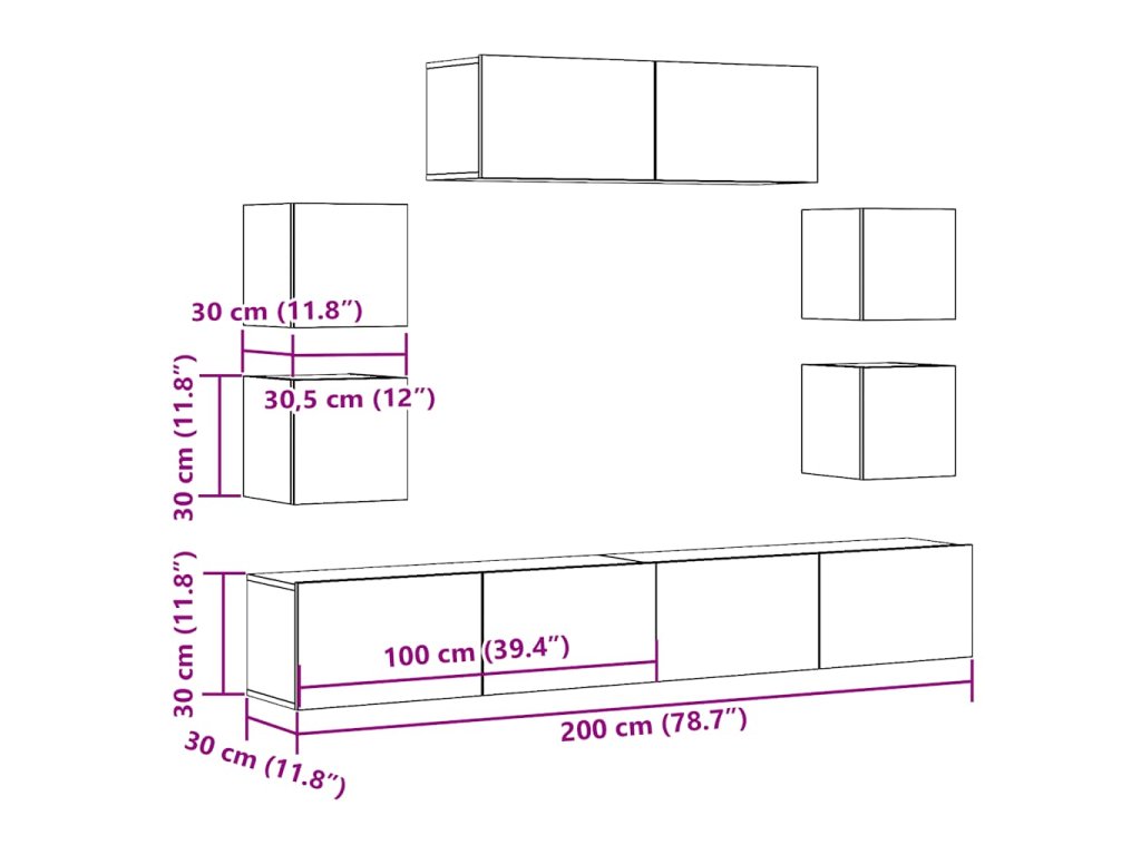 - Rozměry TV skříňky (velká): 100 x 30 x 30 cm (D x Š x V)