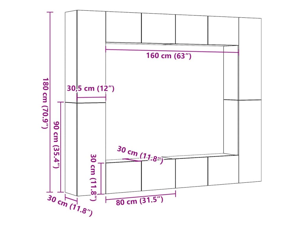- Rozměry nástěnné TV skříňky (malá): 80 x 30 x 30 cm (Š x H x V)
