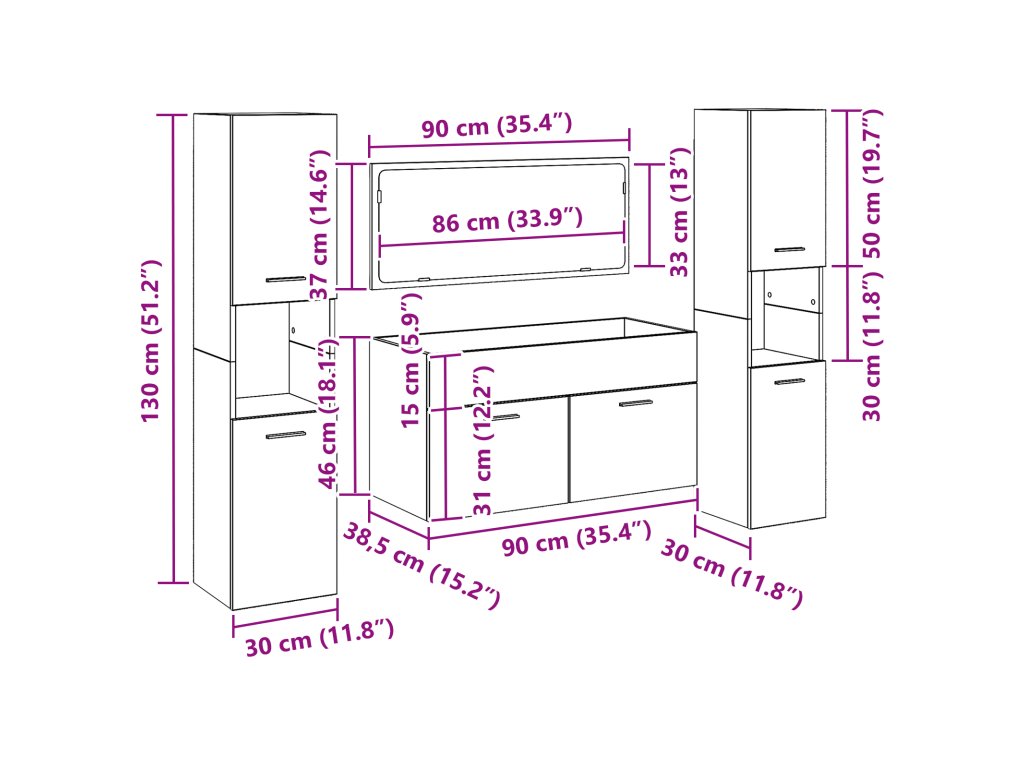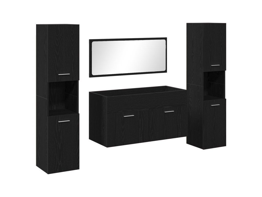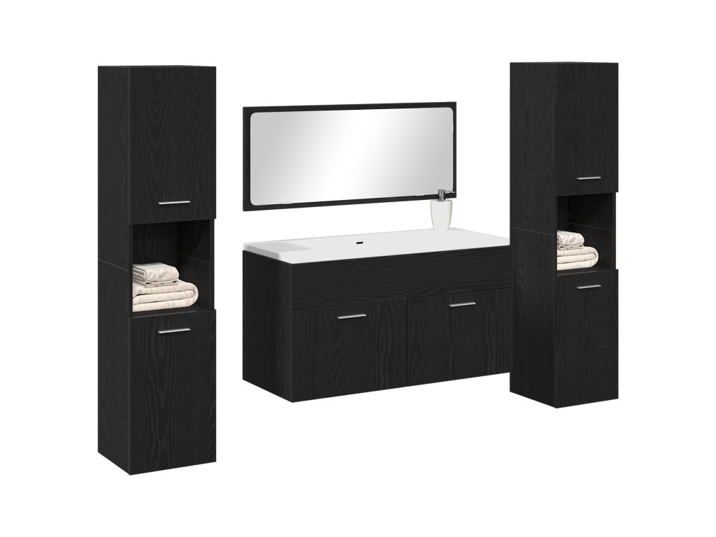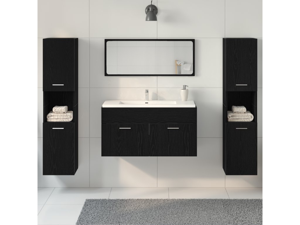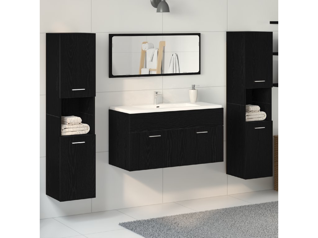 Tato moderní čtyřdílná sada nábytku do koupelny mění funkční dekoraci, spojuje eleganci a praktičnost, aby vylepšila jakoukoli koupelnu. Vyrobená z kvalitní dřevotřísky má hladký černý dubový povrch, což ji dělá skvělou volbou pro každého, kdo chce vylepšit svůj prostor.