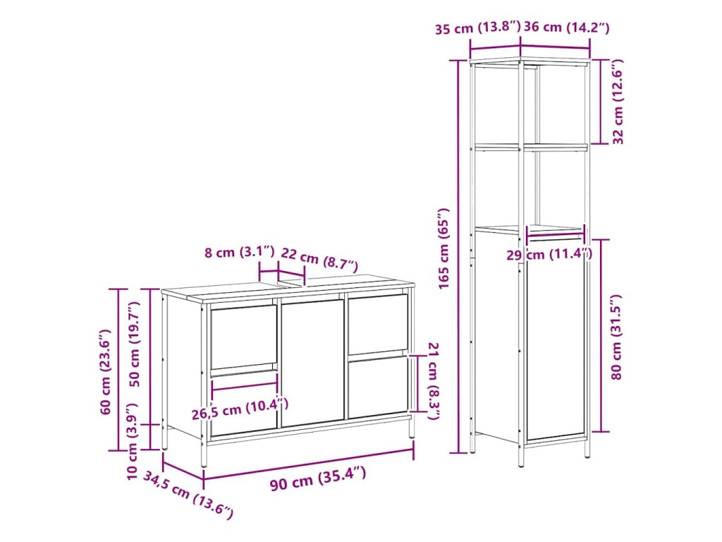- 1 x Koupelnová skříňka: 90 x 34.5 x 60 cm (D x Š x V)