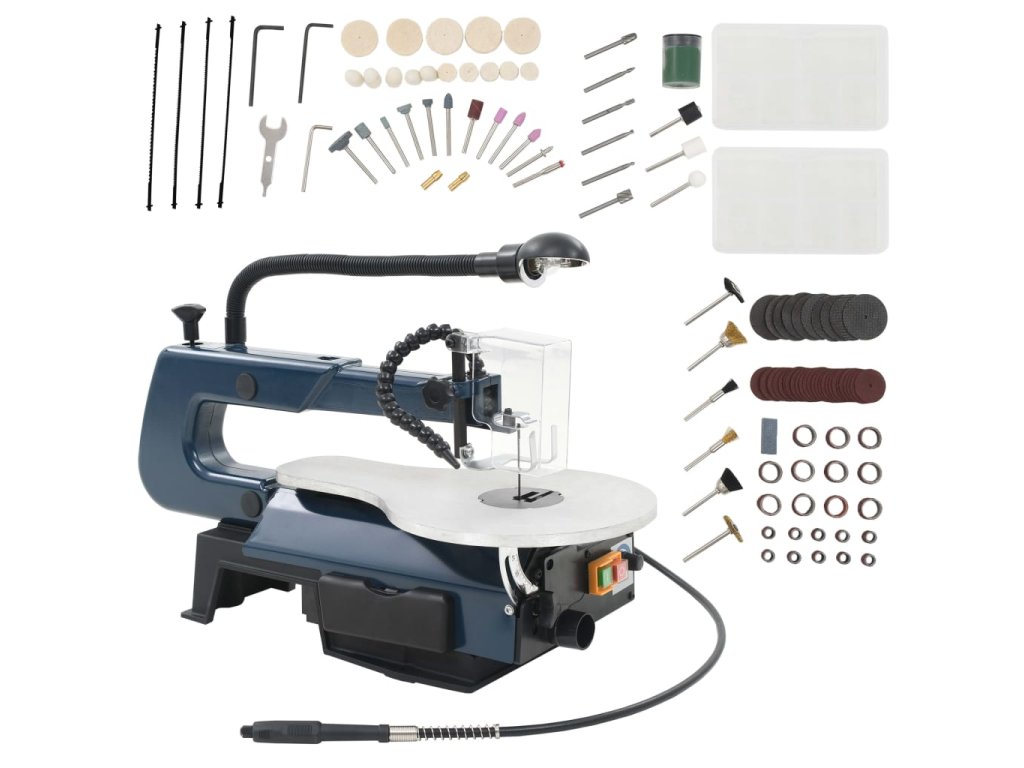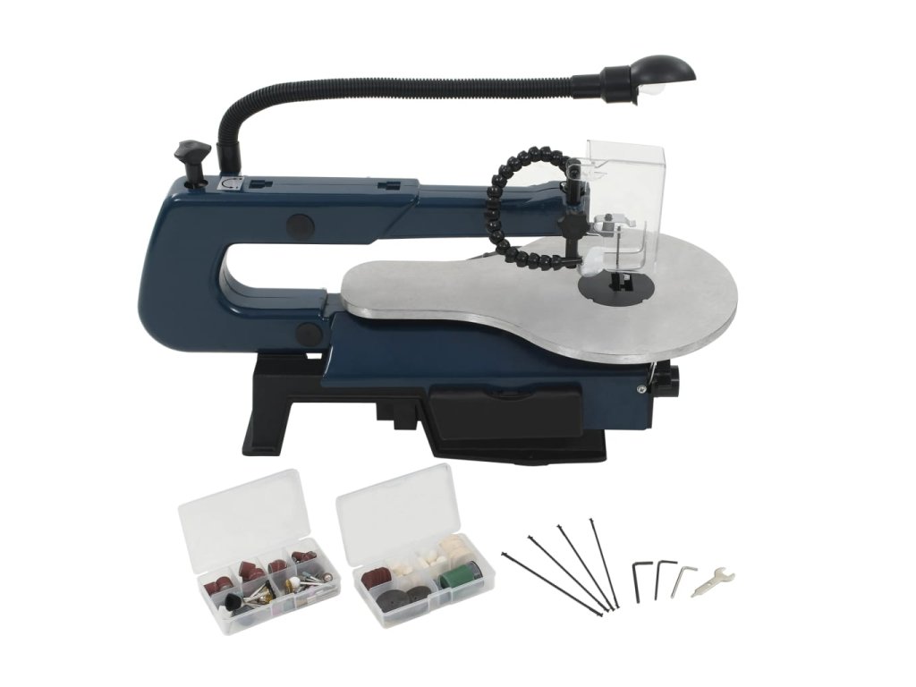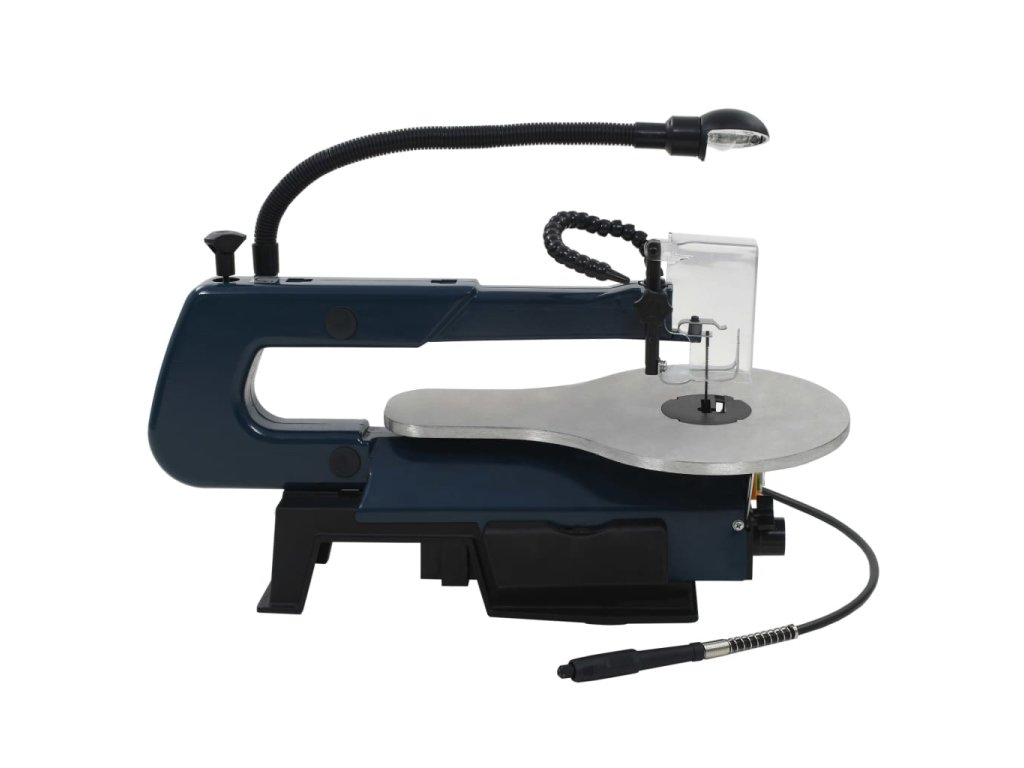 Rychlost lupénkové pily můžete nastavovat v rozmezí od 550 do 1600 otáček za minutu a rychlost flexibilní hřídele v rozmezí od 1650 do 4800 ot./min. To zvyšuje účinnost stroje, takže hravě zvládnete přeřezat i tvrdé dřevo, plast nebo kov. Pracovní stůl je vyrobený z odolného hliníku. Jeho sklopením pod úhlem 0 až 45° snadno dosáhnete přesnějších a preciznějších výsledků. Spolu s lupénkovou pilou obdržíte i další 4 pilové listy k řezání různých tvrdých materiálů. Veškeré malé příslušenství je uloženo v šikovném polypropylenovém boxu, takže si můžete snadno zorganizovat veškeré příslušenství na jednom místě.