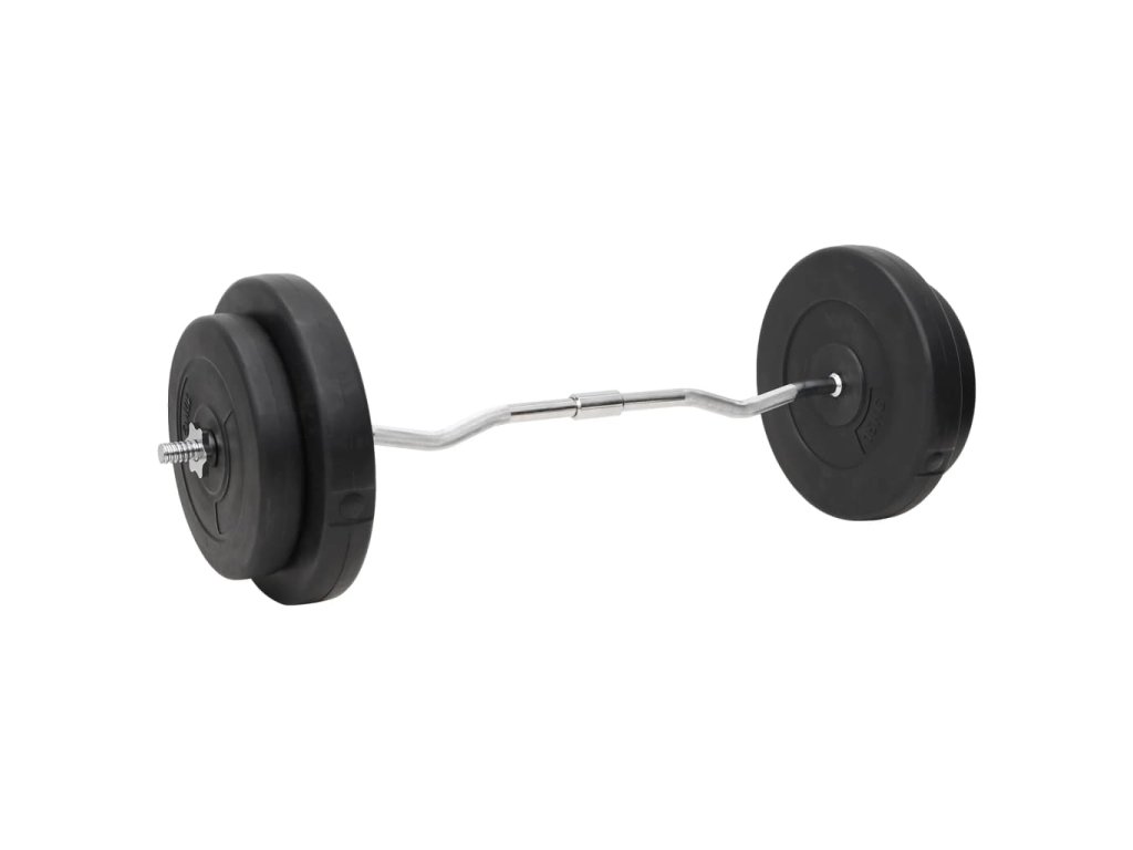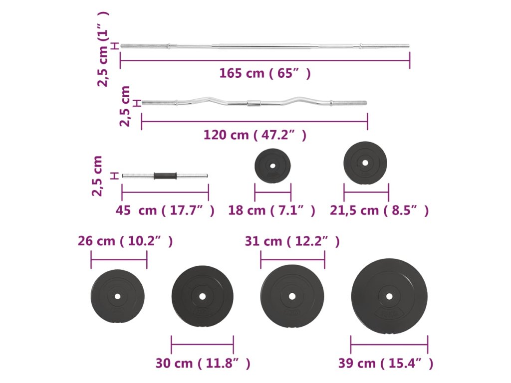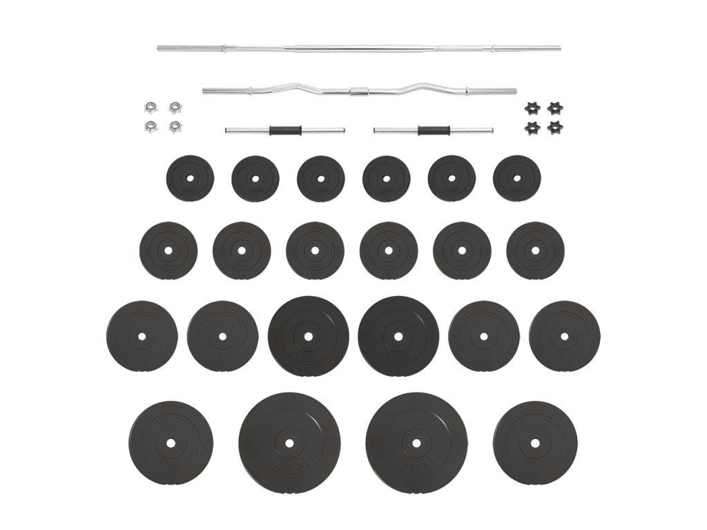 - Hmotnost kotoučů: 2x 7,5 kg, 6x 2,5 kg, 6x 1,25 kg, 4x 5 kg, 2x 15 kg, 2x 10 kg