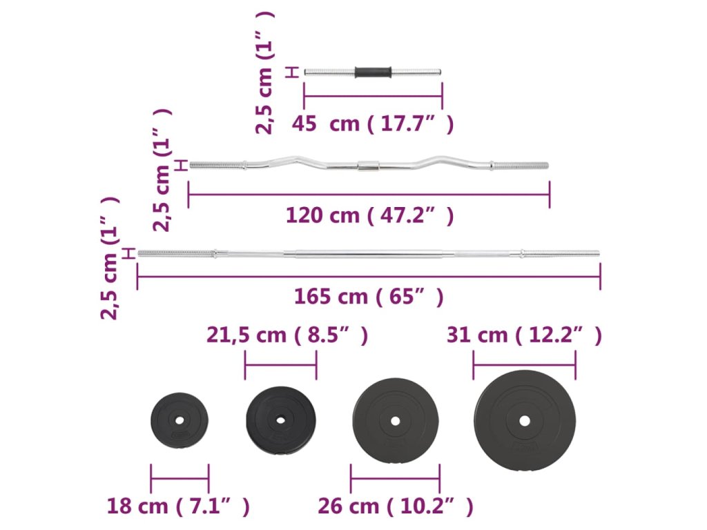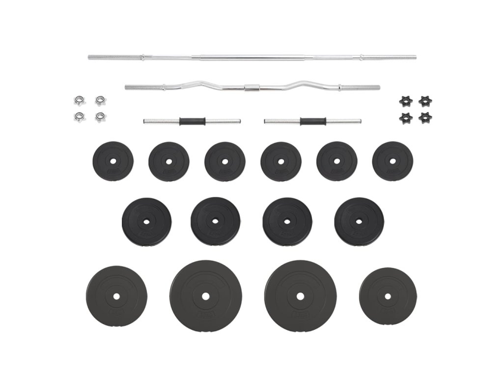 - Hmotnost kotoučů: 4x 2,5 kg, 6x 1,25 kg, 2x 5 kg, 2x 10 kg