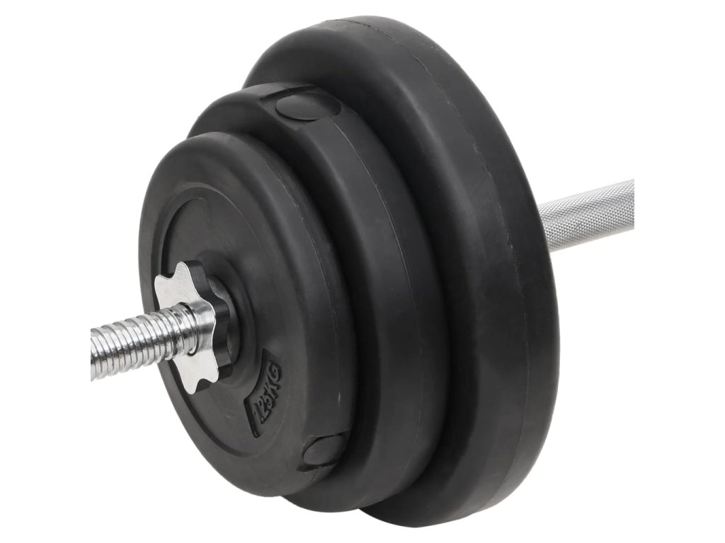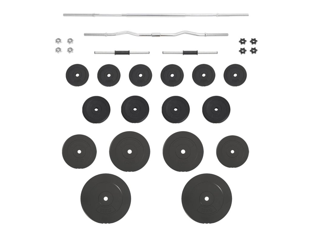 - Hmotnost kotoučů: 4x 2,5 kg, 6x 1,25 kg, 2x 10 kg, 2x 5 kg, 2x 15 kg