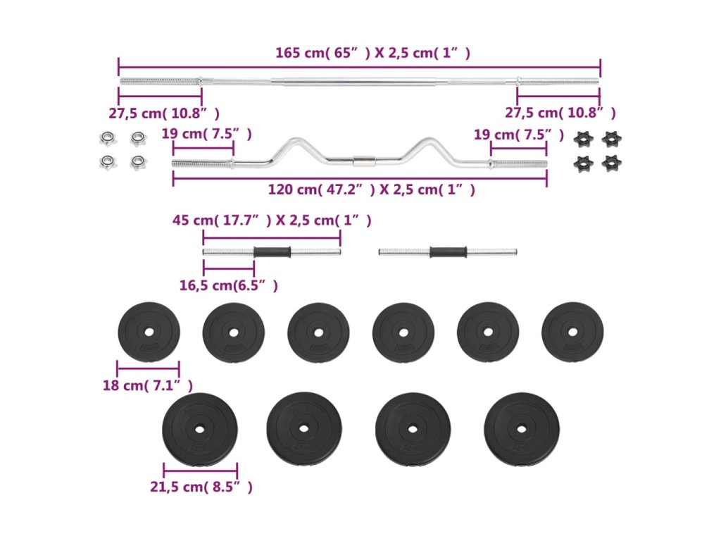 - Rozměry činkové tyče: 2,5 x 45 cm (průměr x D)