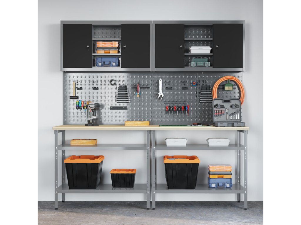 Tato sada nástěnného úložiště v průmyslovém stylu je ideální do každé garáže nebo dílny. Pomůže ti uspořádat nástroje a dodá trendy industriální vzhled. Udělaná z odolných šedých a černých ocelových panelů, je praktická a stylová, takže je to skvělý pracovní prostor pro všechny tvé projekty.