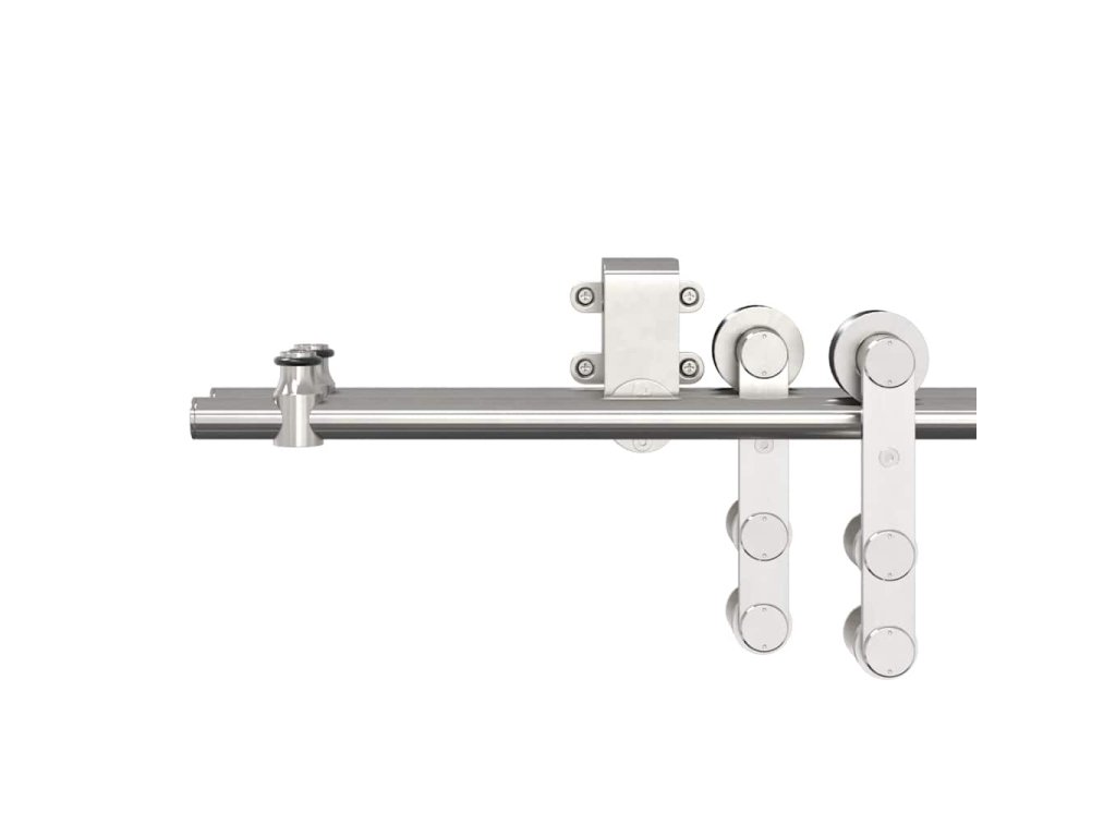 - Ideální pro dvojitá stodolová vrata: V případě omezeného prostoru na stěně umožňuje sada obchozího držáku stodolových dveří nezávislé posouvání dvou stodolových dveří po dvou kolejnicích bez nutnosti dalšího volného prostoru.