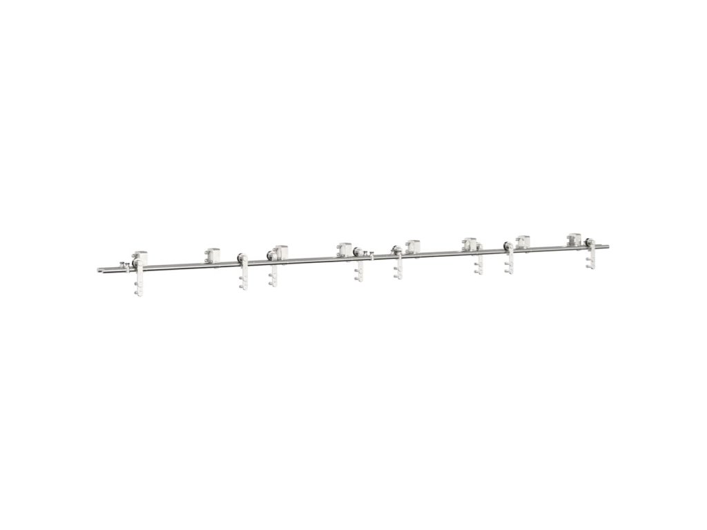 - Ideální pro dvojitá stodolová vrata: V případě omezeného prostoru na stěně umožňuje sada obchozího držáku stodolových dveří nezávislé posouvání dvou stodolových dveří po dvou kolejnicích bez nutnosti dalšího volného prostoru.