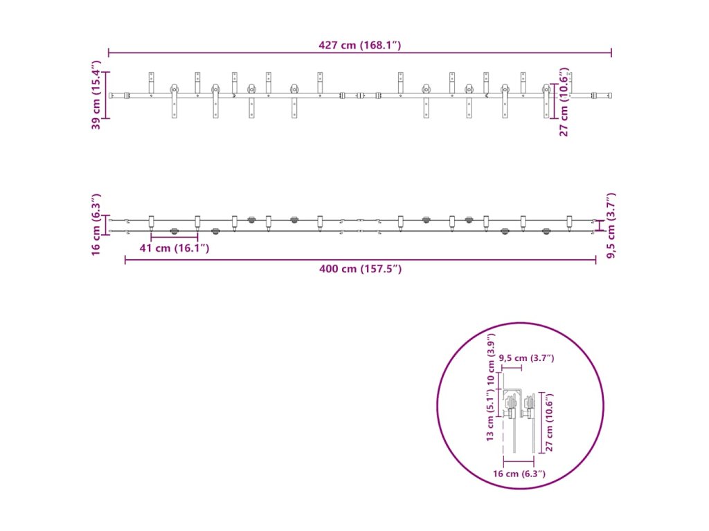 - Ideální pro dvojitá stodolová vrata: V případě omezeného prostoru na stěně umožňuje sada obchozího držáku stodolových dveří nezávislé posouvání dvou stodolových dveří po dvou kolejnicích bez nutnosti dalšího volného prostoru.