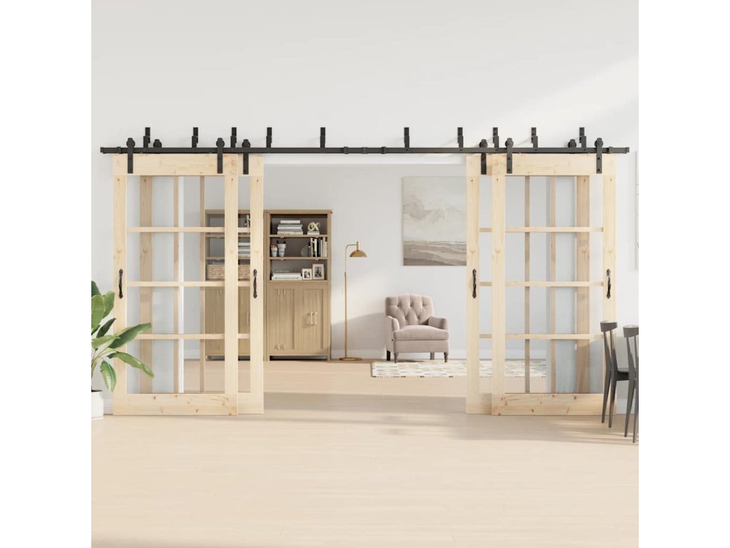 Pomocí této sady kování pro posuvné dveře můžete snadno nastavit dvě kolejnice pro dvojici dveří, které se budou posouvat před sebou a za sebou.