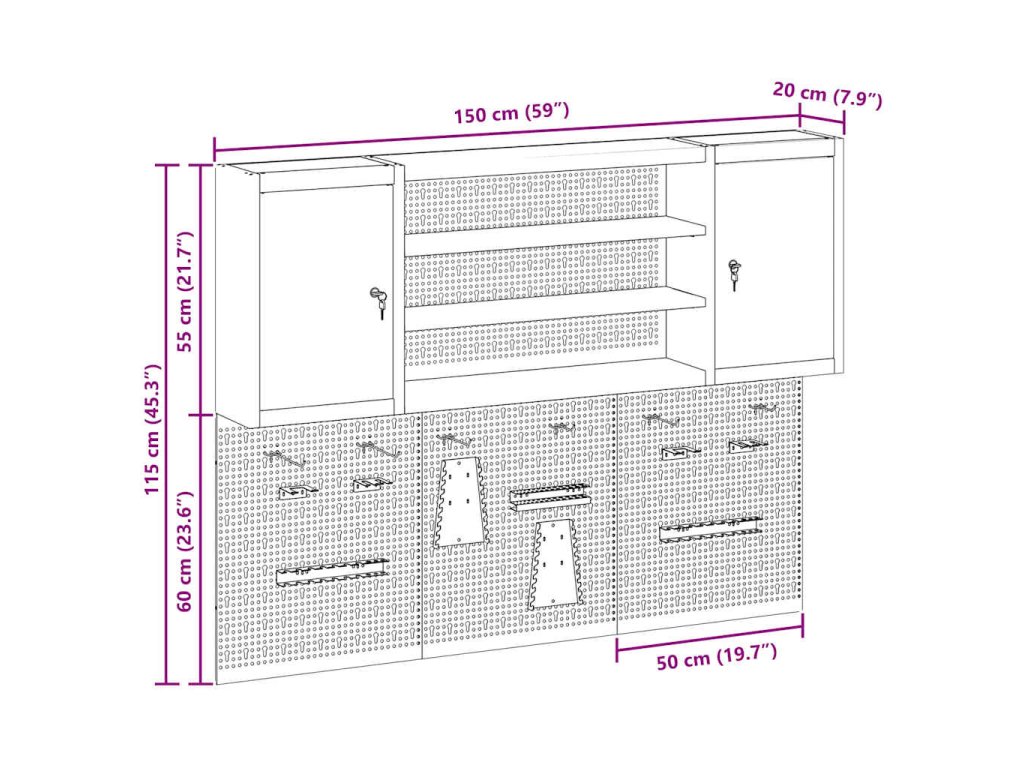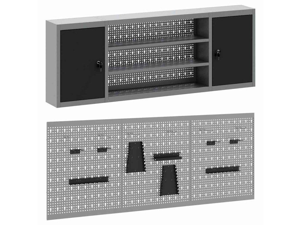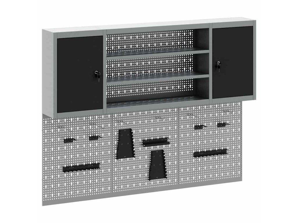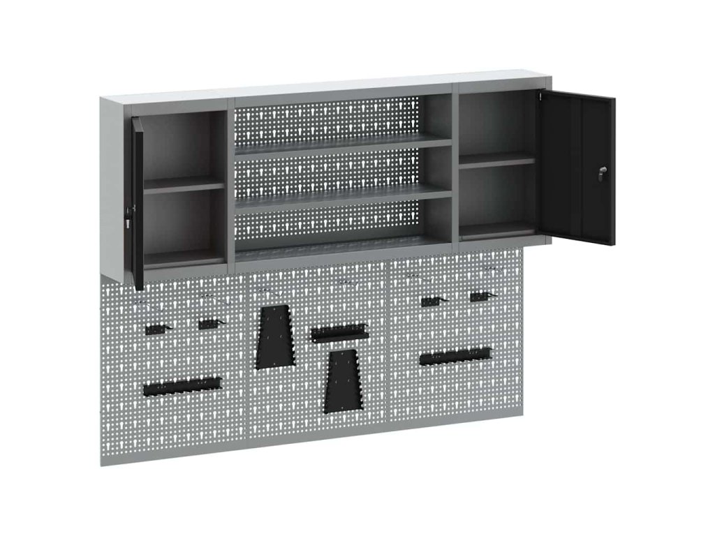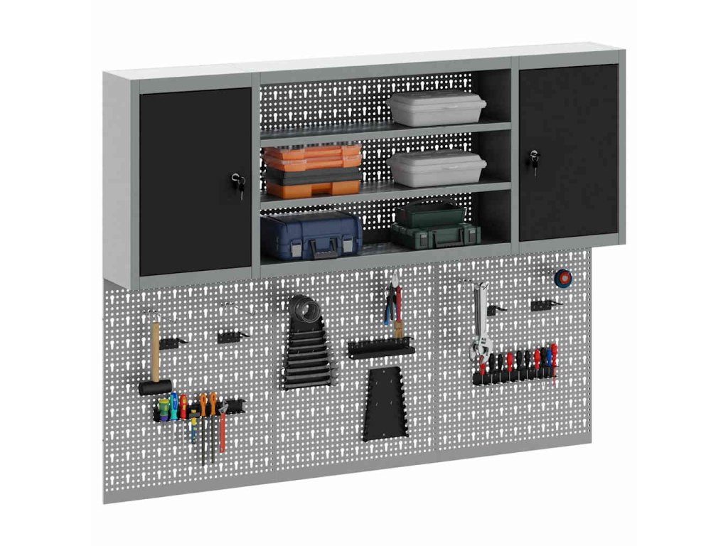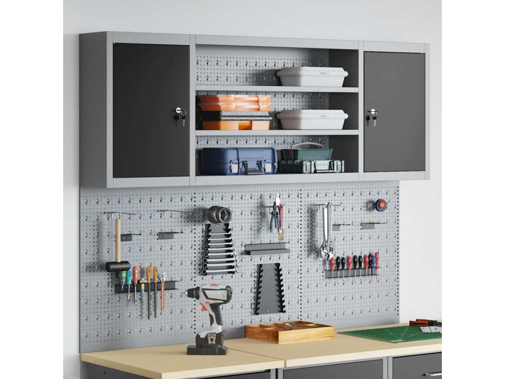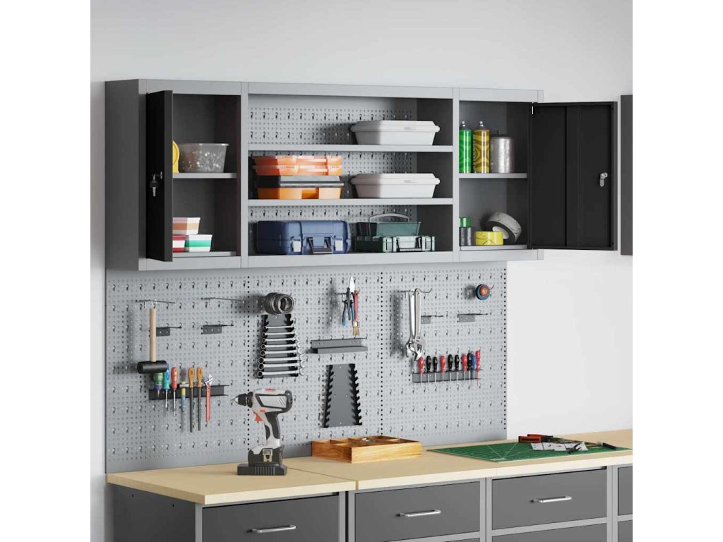 Tato nástěnná skříňka na nástroje a sada nástěnky je nezbytná pro udržení pořádku v dílně. Má industriální styl, který se hodí do rušného pracovního prostředí nebo koutku pro koníčky a pomáhá milovníkům nástrojů a profíkům zůstat organizovaný.