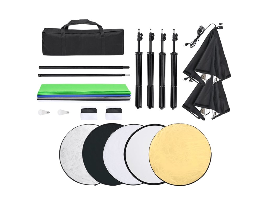 Tato flexibilní sada do fotoateliéru s pozadím a systémem osvětlení se softboxy a odraznou deskou 5 v 1 je vhodná pro fotografování/filmování ve studiu i na cestách.