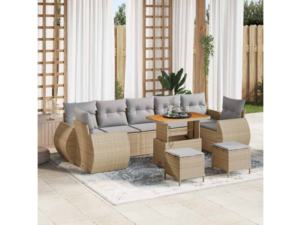 - Materiály: Tento zahradní set spojuje poly ratan a masivní akáciové dřevo, což znamená skvělou kombinaci stylu a odolnosti. Poly ratan dodává elegantní texturu, zatímco akáciové dřevo zaručuje robustnost a luxusní vzhled, zajišťující, že souprava vydrží i sezónní použití.