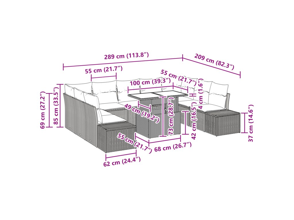 - Dodávka obsahuje: 2 x boční pohovka s úložným prostorem, 2 x rohové sedadlo s úložným prostorem, 5 x centrální sedadlo s úložným prostorem, 1 x zahradní stůl