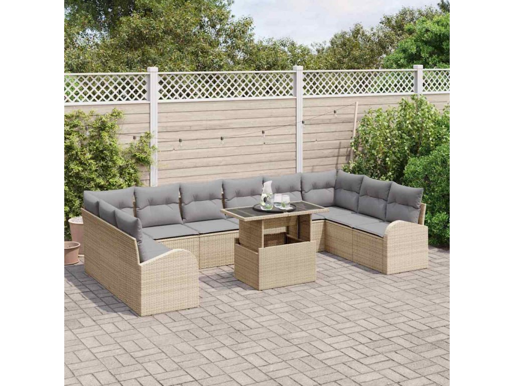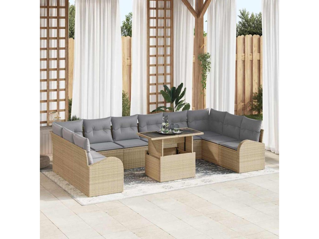 Tato sada zahradní pohovky se 11 kusy kombinuje stylový design a praktické využití, ideální pro vytvoření příjemné atmosféry venku. S moderním vzhledem, co spojuje béžový poly ratanový rám s šedými polštáři, nejen že ozdobí tvůj balkon nebo terasu, ale nabídne taky spoustu pohodlného sezení pro rodinu a kámoše.