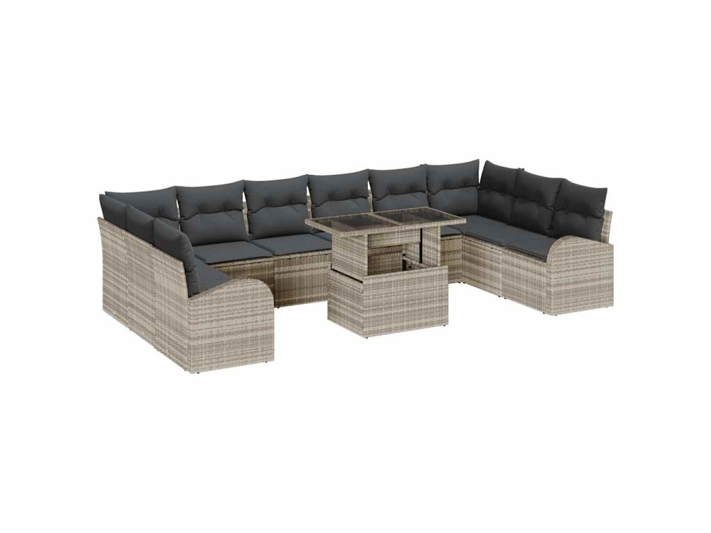 Tato sada zahradních pohovek v 11 dílech spojuje styl a praktičnost, takže je ideální pro váš venkovní prostor. Moderní design má elegantní béžový rám z poly ratanu s světle šedými polštáři, přidává svěžest na váš balkon nebo terasu a nabízí dostatek místa pro rodinu a přátele.