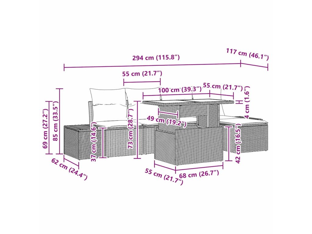 - Dodávka obsahuje: 2 x Boční pohovka s úložnou funkcí, 2 x Centrální sedadlo s úložnou funkcí, 1 x Nožní stolek s úložnou funkcí, 1 x Zahradní stůl