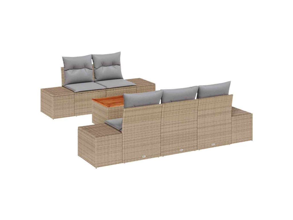 Materiály: Sedací souprava je vyrobena z odolných materiálů, včetně poly ratanu tkaného kolem práškově lakovaného ocelového rámu a doplněného o celistvé akáciové dřevo. Tyto materiály zajišťují stabilitu a dlouhou životnost, čímž jsou ideální pro venkovní rekreaci. UV-odolné vlastnosti chrání před tvrdým slunečním zářením, udržují soupravu vypadat prvotřídně i po čase.,Součásti: Tato souprava zahrnuje více kusů: hlavní centrální sedadlo s úložným prostorem, více pohovek a zahradní stůl, každý vybaven voděodolnými úložnými taškami. Tyto komponenty jsou navrženy tak, aby zvýšily funkčnost a zajistily harmonické propojení s přírodou při maximalizaci prostorové efektivity.,Funkce / Design: S modulární konstrukcí poskytuje souprava všestrannost v uspořádání sezení. Nastavitelné nožičky umožňují uživatelům přizpůsobit výšky pro rovné terasy nebo travnaté plochy, což zajišťuje dodatečný komfort pro prodloužené sezení. Její čisté, moderní linie hladce zapadají do různých designových estetik.,Odporučené použití: Ideální pro zahrady, terasy a zahrady, tato souprava uspokojuje sezónní setkání, osamělou relaxaci nebo neformální stolování. Elegantní vzhled a funkční atributy podporují různé nastavení, od jarního brunchu až po letní lenošení.,Péče a údržba: Správná péče prodlužuje životnost tvého nábytku. Chraň ho krytem, když není používán, aby si udržel svěží vzhled. Snadná údržba nabádá k dalšímu užívání této úžasné venkovní sezení.- Barva: Béžová a světle šedá