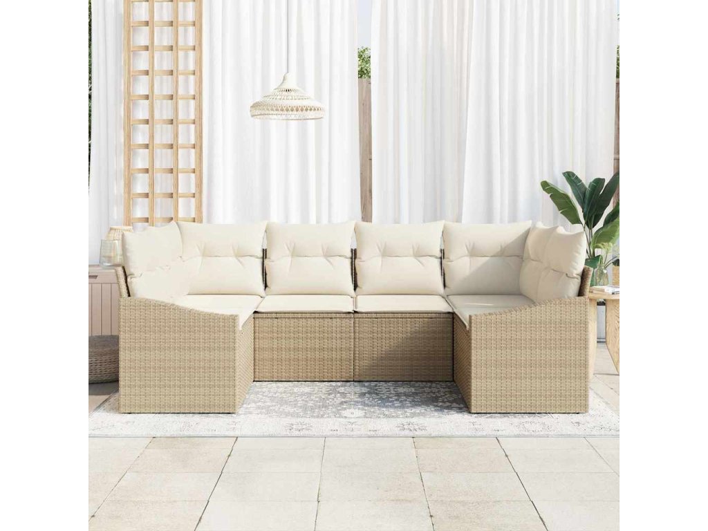 Tahle modulární venkovní sekční pohovka přináší moderní atmosféru a spoustu flexibility. Skvělá pro až šest lidí. Vyrobená z pevných béžových poly ratanu a pohodlných krémových polštářů, přetváří tvé venkovní nebo slunečné prostory na ideální místa pro relaxaci a zábavu.