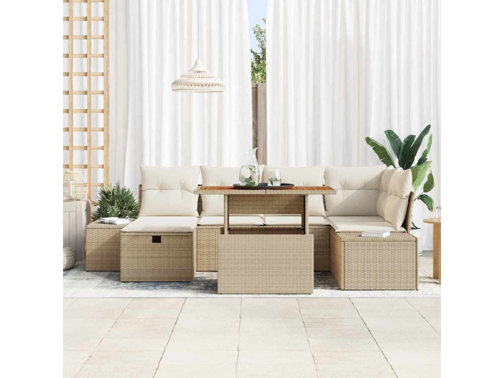 Tento 7dílný zahradní jídelní set v béžové barvě je skvělá volba pro venkovní zábavu a relaxaci. Díky modulárnímu designu si ho můžeš nastavit podle sebe, takže se vejde na tvé patio nebo balkon, a poskytne místo až pro šest lidí. Zároveň máš možnost schovat polštáře a další věci, které nechceš mít na očích.