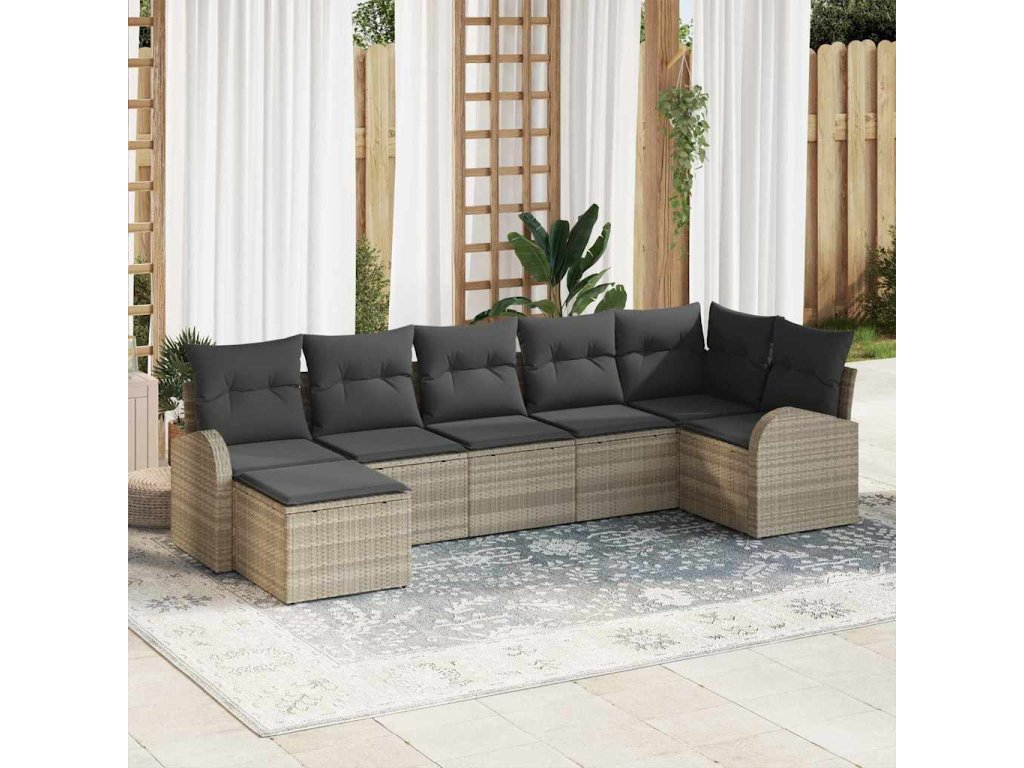 Tato modulární venkovní pohovka pro 7 lidí je perfektní doplněk každé zahrady nebo terasy. Kombinuje moderní styl s praktickým použitím. Poly ratanový exteriér má pěkné tkané detaily, které jí dodávají cool vzhled. Je navržená na venkovní použití, skvěle se hodí na společenské akce i na klidné lenošení. Sada obsahuje různé moduly, které si můžeš uspořádat podle sebe na různé příležitosti.