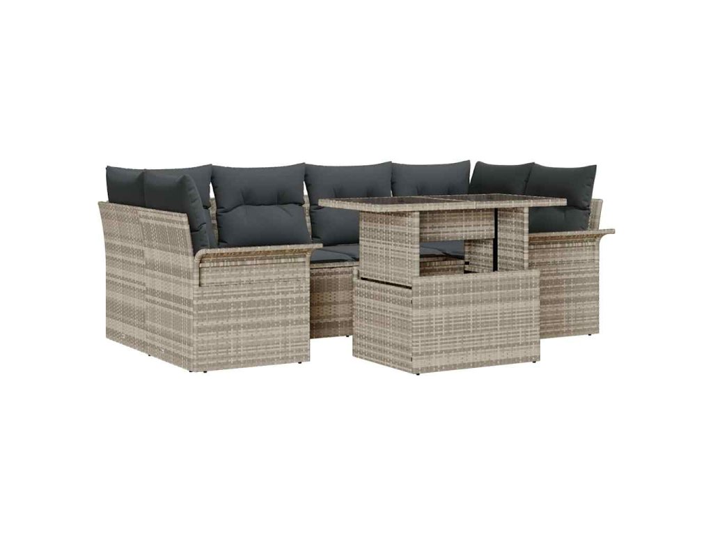 Tato 7dílná zahradní pohovková souprava spojuje styl a funkčnost, čímž vytváří pohodlný prostor pro zábavné akce nebo klidné večery. Moderní design s béžovým tkaným ratanu a šedými polštáři přidává šmrnc jakémukoli balkonu nebo zimní zahradě a nabízí sezení pro až šest lidí. Je ideální pro hostování kamarádů, popíjení ranní kávy nebo vychutnávání západu slunce, skvěle ladí s tvým interiérem nebo venkovním stylem.