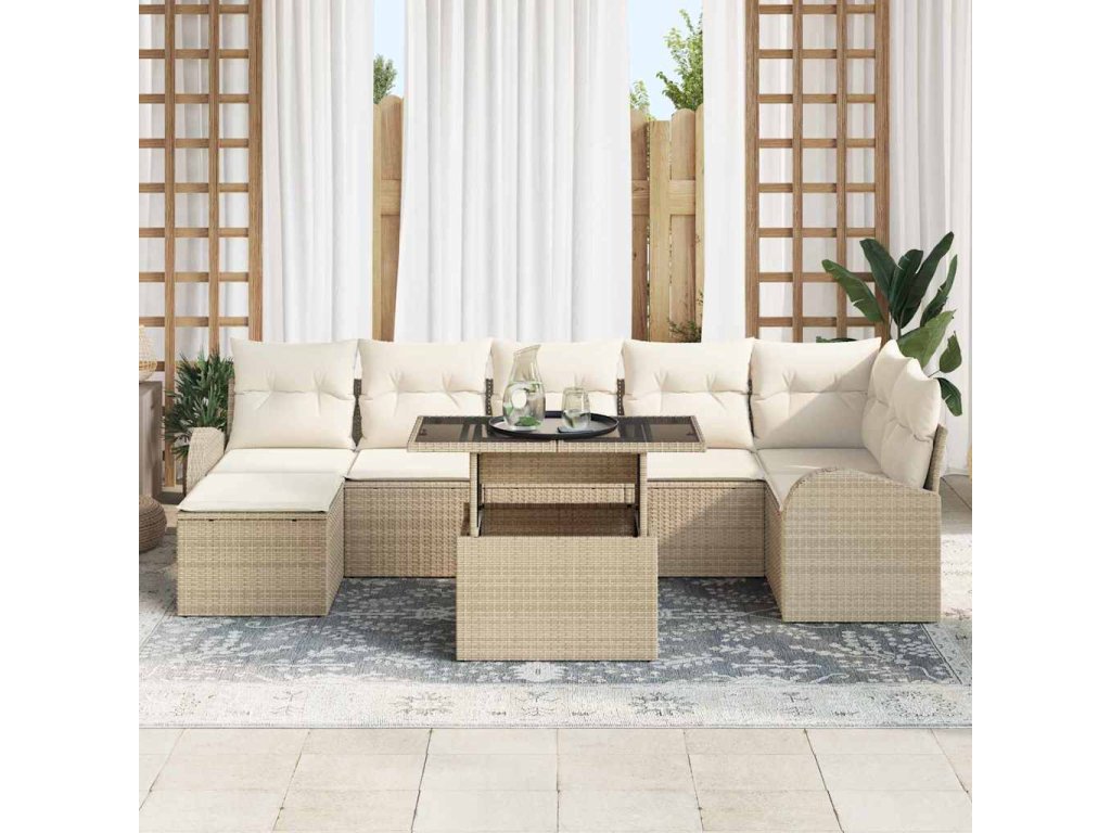 Tato sestava zahradního sofa je skvělým mixem moderního stylu a praktických výhod. Vyrobená z měkkého béžového poly ratanu, změní tvou terasu nebo balkon na příjemné místo, které dodá pohodlí a styl každé události.