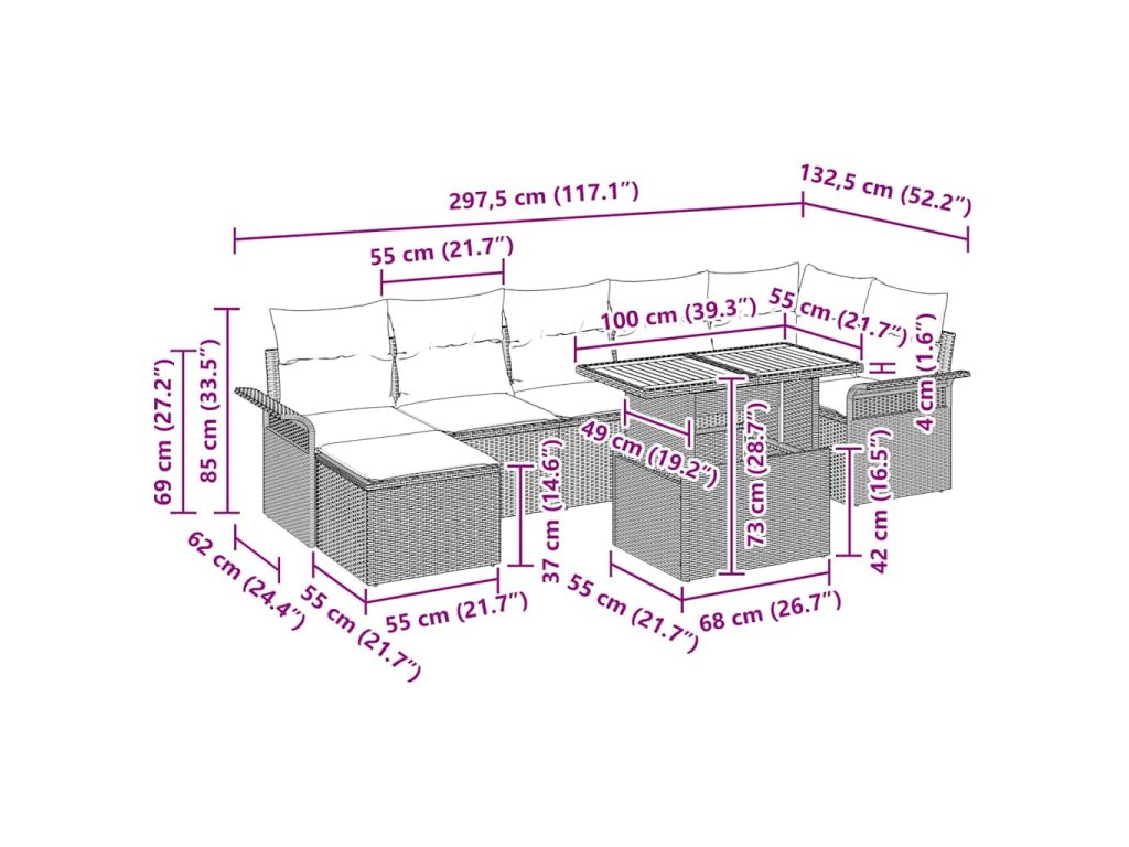 - Dodávka obsahuje: 2 x Pohovka s opěrkou s úložným prostorem, 1 x Rohový sedák s úložným prostorem, 3 x Středový sedák s úložným prostorem, 1 x Taburet s úložným prostorem, 1 x Zahradní stůl