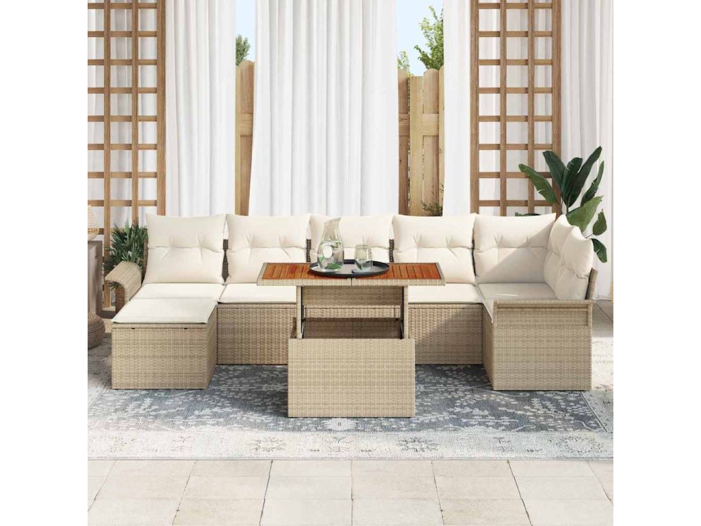Osmidílná zahradní sada na stolování spojuje styl a pohodlí. Skvělá na venkovní akce a relaxační chvíle. Je vyrobena z odolného béžového poly ratanu a měkkých bílých polštářů, takže dodává vašemu prostoru šmrnc.