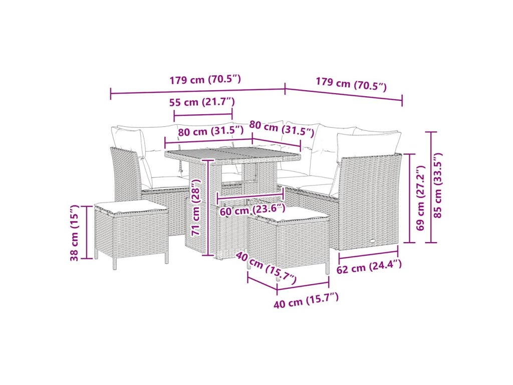 - 3 x Rohové sedadlo: 62 x 62 x 69 cm (D x Š x V)