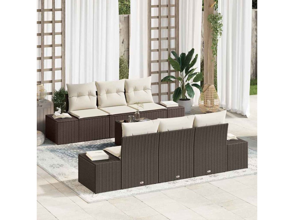 - Součásti: Dostaneš dvě centrální sedadla, čtyři boční pohovky a stůl, což poskytuje pohodlné uspořádání pro společenské chvíle. Každý kus má pěnové polštáře s polyesterovým potahem a zipy pro snadné čištění. Zakřivené opěrky rukou a poly ratanové záda poskytují extra oporu.