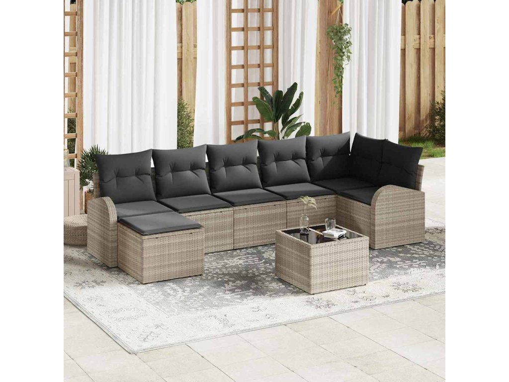 Tato modulární venkovní pohovka pro 7 lidí je perfektní doplněk každé zahrady nebo terasy. Kombinuje moderní styl s praktickým použitím. Poly ratanový exteriér má pěkné tkané detaily, které jí dodávají cool vzhled. Je navržená na venkovní použití, skvěle se hodí na společenské akce i na klidné lenošení. Sada obsahuje různé moduly, které si můžeš uspořádat podle sebe na různé příležitosti.
