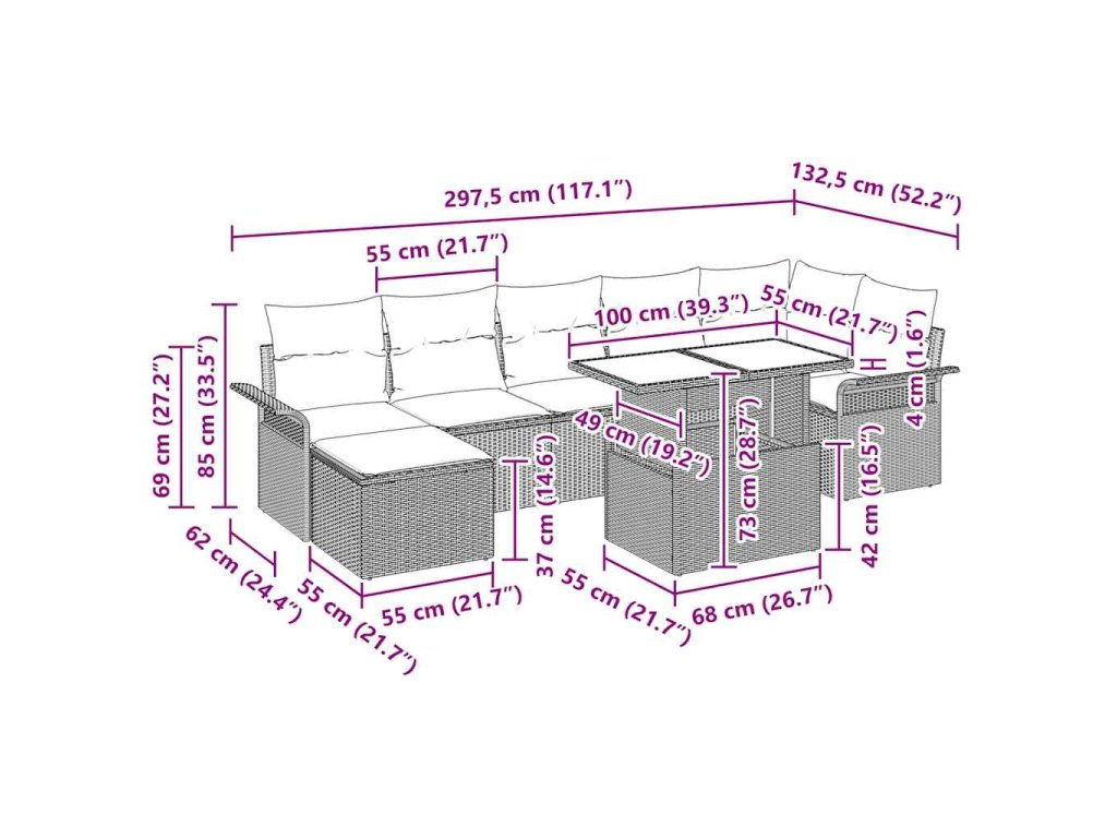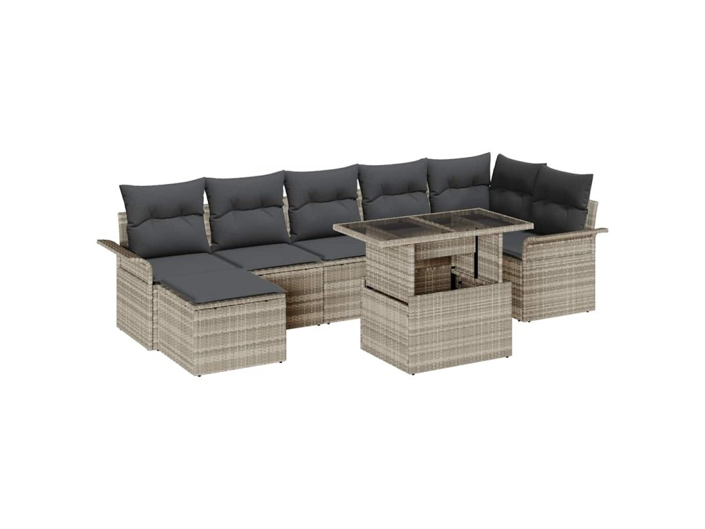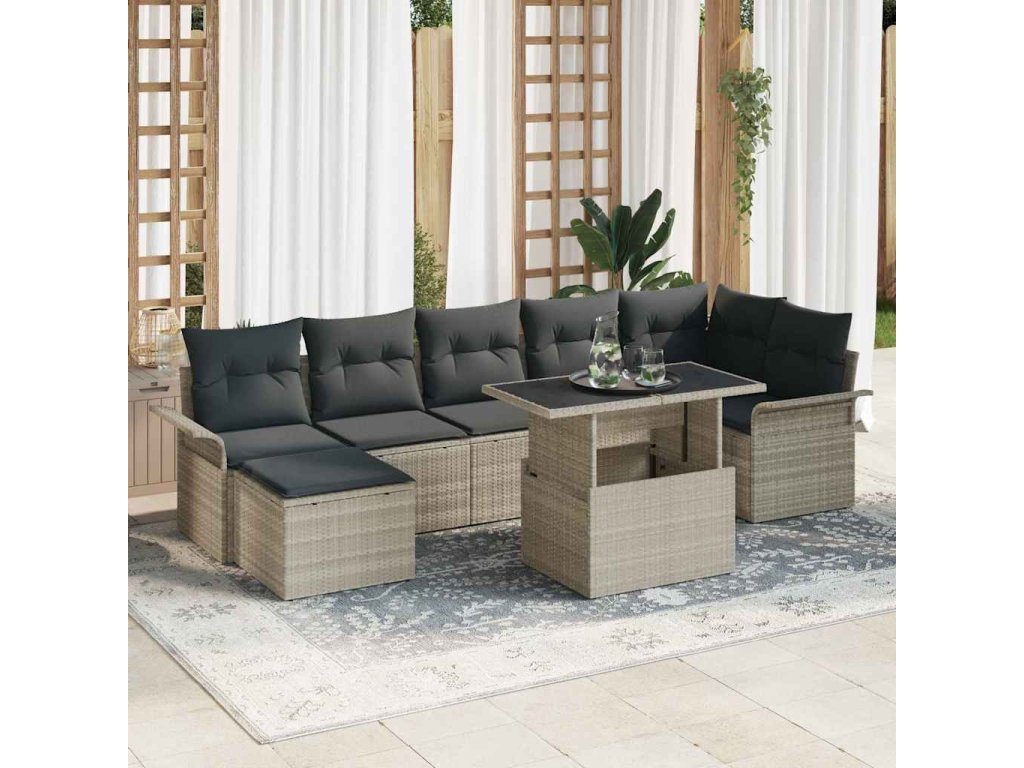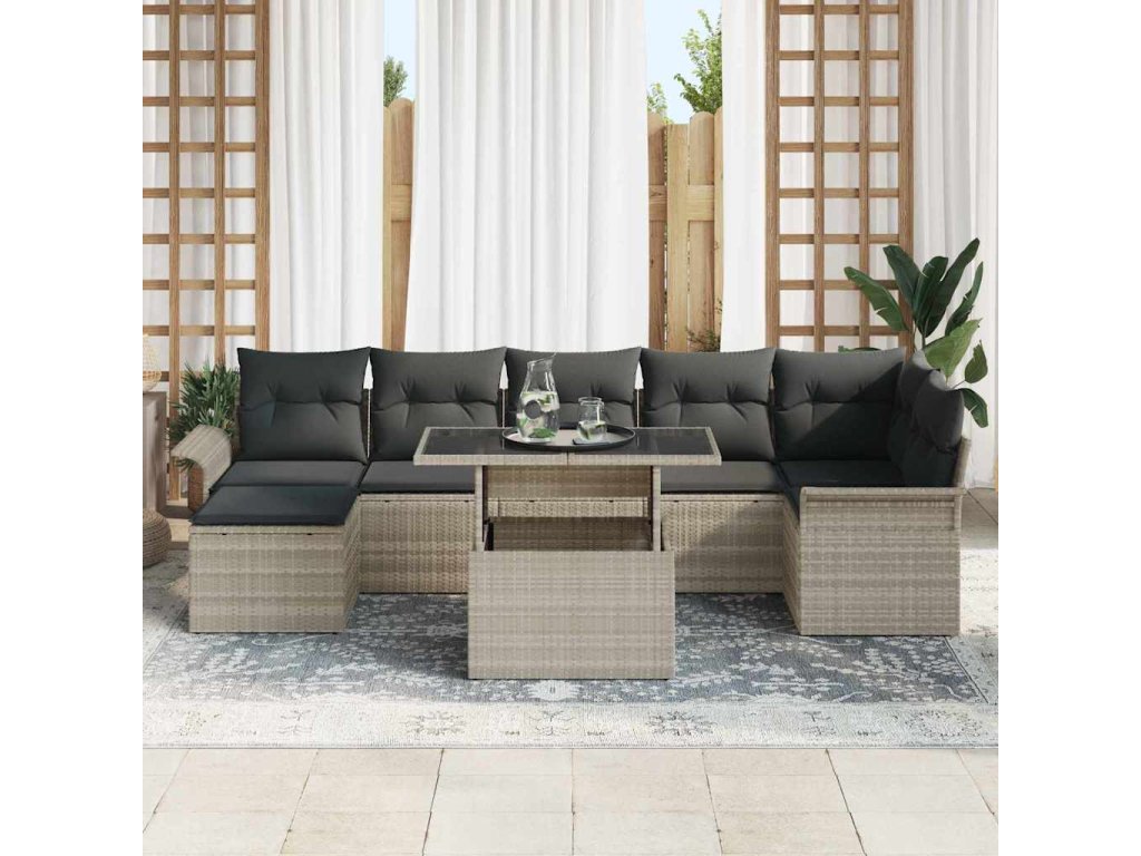 - Zahrnuté komponenty: Sada obsahuje rohovou sedačku, tři střední sedačky, dva křesla, taburet a pevný stůl, vše pro vaše pohodlí a styl. Poly ratán zajišťuje pohodlné sezení a taburet můžete použít jako další sezení nebo místo k odpočinku.