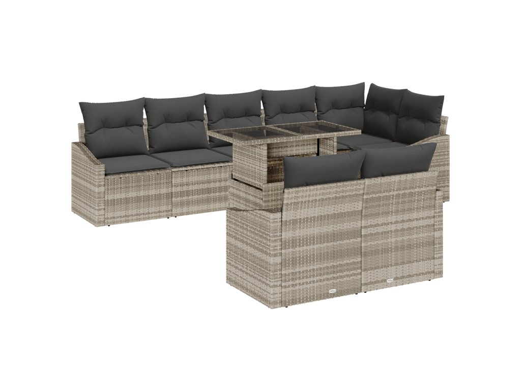 Tato 9-dílná zahradní souprava pohovky s polštáři změní venkovní prostor na pohodlné a stylové místo. Je ideální pro oslavy, relaxaci nebo jen tak na posezení v zahradě. Moderní design s hezkým světle šedým poly ratanem a měkkými polštáři dává dohromady odolnost a eleganci.