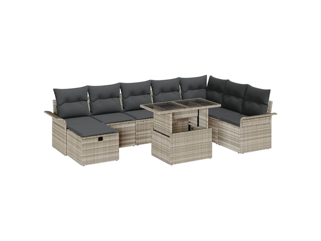 Tento 9 dílný zahradní pohovkový set je skvělý doplněk jakéhokoli venkovního prostoru, navržený pro pohodlí s místem pro až 8 lidí. Elegantní světle šedý poly ratan v kombinaci s měkkými šedými polštáři vytváří moderní a pohodlnou atmosféru, ideální pro rodinné setkání nebo jen tak si užívat slunce na zahradě nebo balkonu.