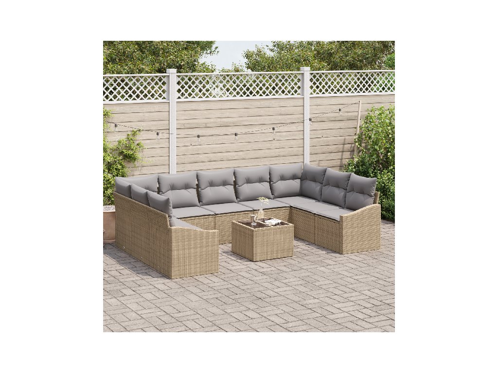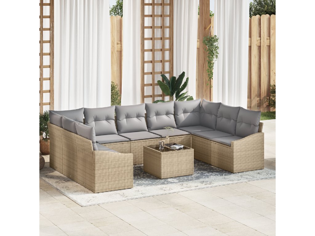 Tato 10-dílná zahradní jídelní souprava s polštáři je super stylová a praktická. S místem pro až devět lidí je ideální pro setkání nebo lenošení. Pohodlně ubytujete přátele a rodinu, zatímco si užíváte výhled.