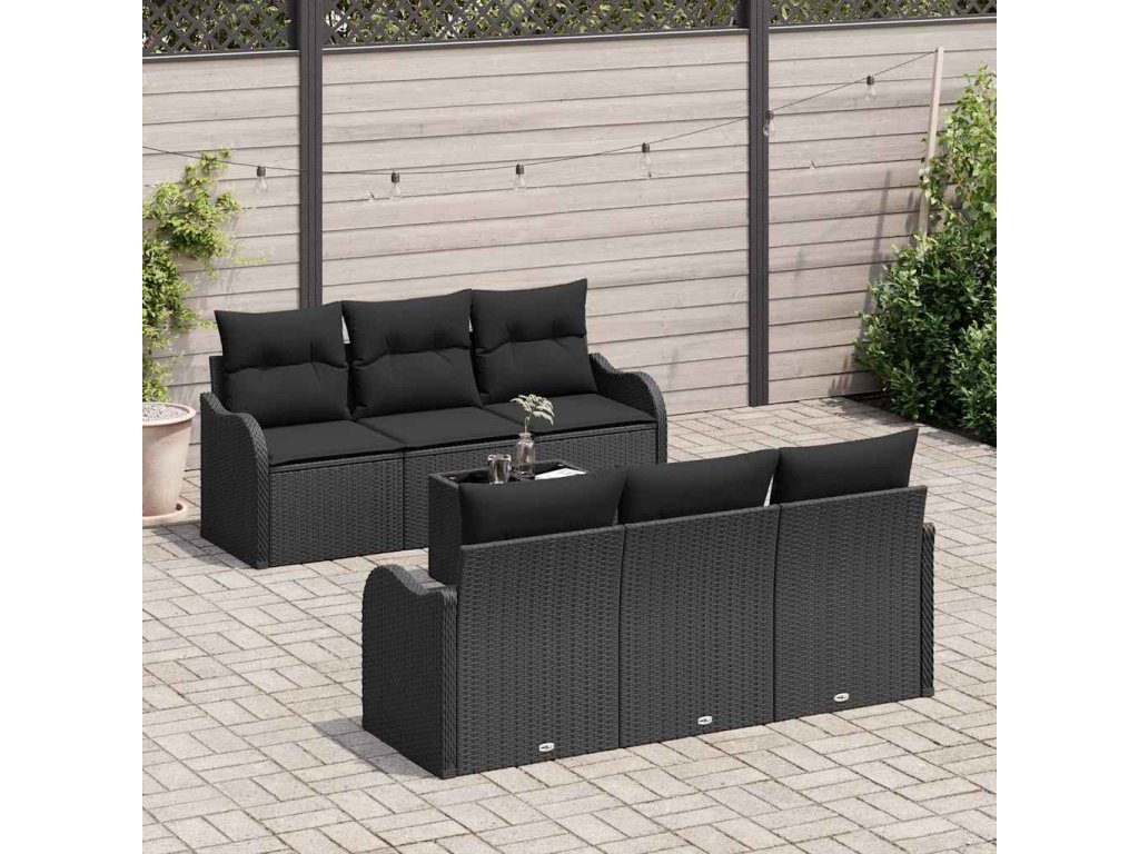Tato 7dílná zahradní pohovková sada je naprosto nezbytná pro venkovní prostory. Je vyrobená z elegantního černého poly ratanu, který je jak pěkný, tak odolný. Pohodlné polštáře dodávají eleganci a komfort, což z ní dělá ideální místo pro setkání nebo příjemné večery venku.
