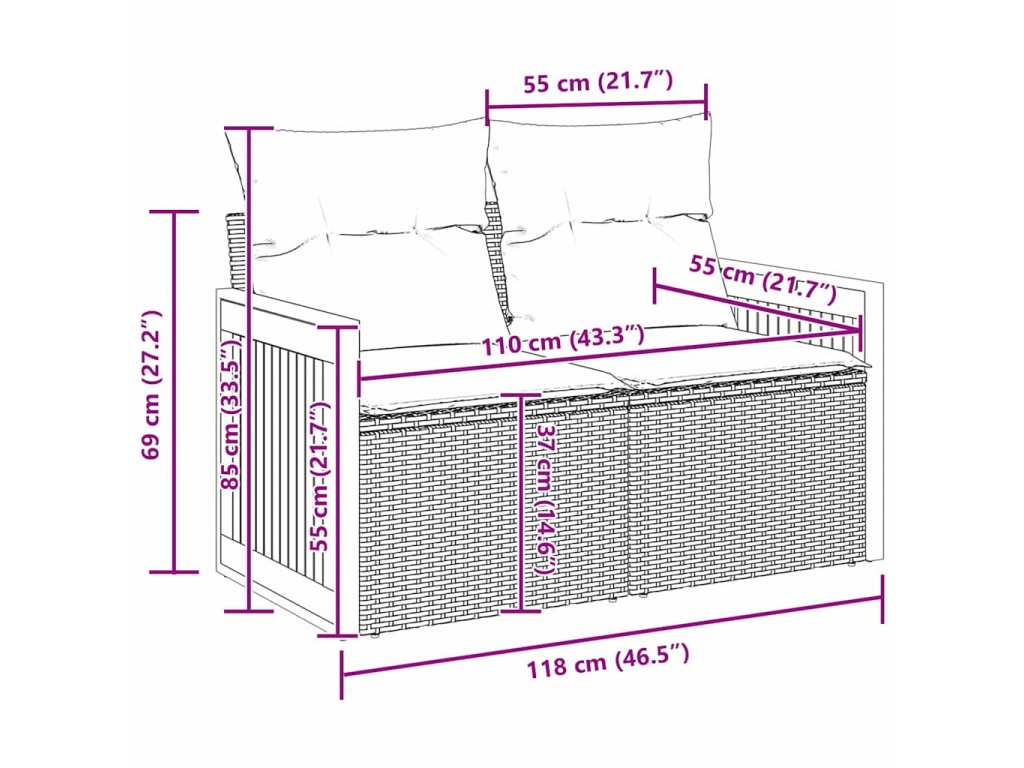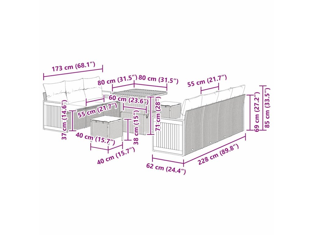 - Součásti: Dostanete 4 arm sofas, 3 středové sedačky, 2 čtvercové taburety a stůl - všechny s chytrými úložnými možnostmi. Díky tomu můžete pohodlně schovat svoje věci, přičemž každý kus je navržen pro vaše pohodlí a praktickost venku.