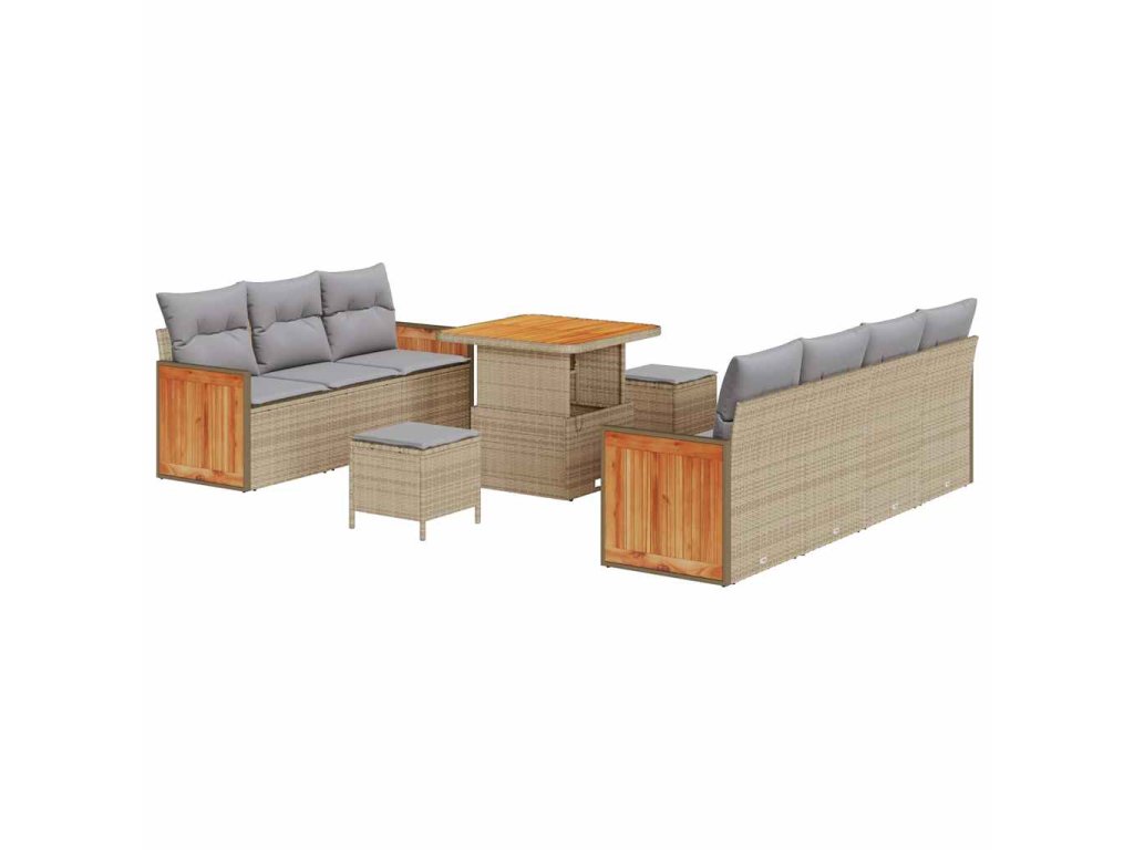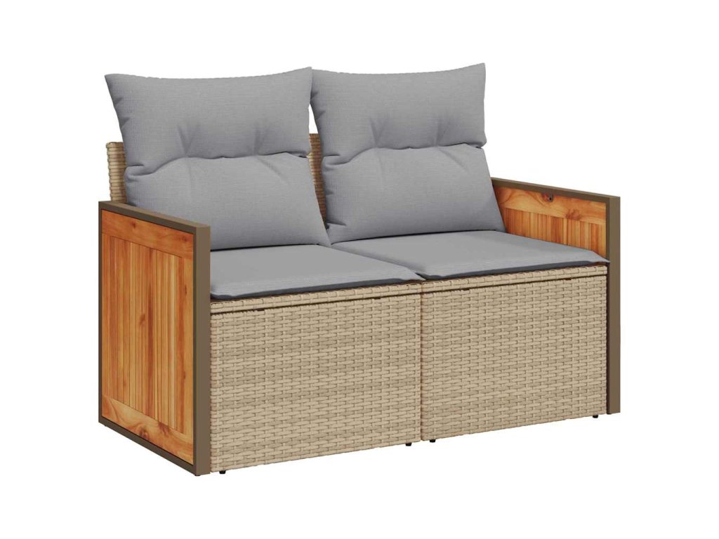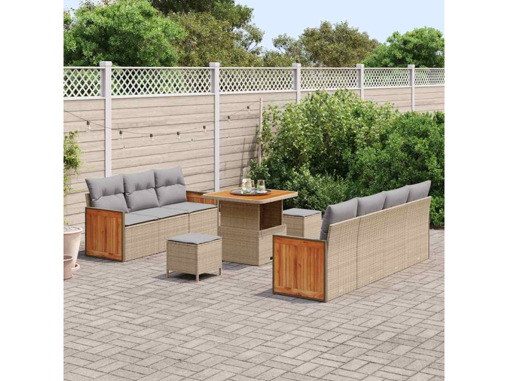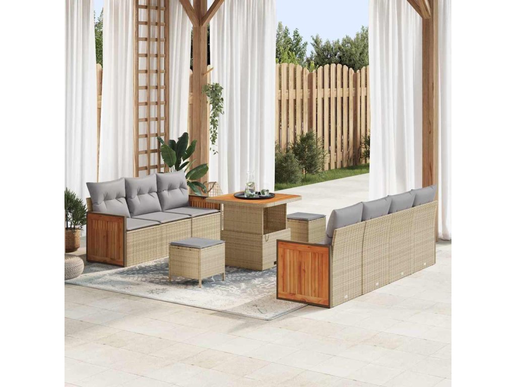 - Materiály: Sada zahradního sofa je převážně vyrobena z poly ratanu, který je fakt odolný proti UV záření, takže dobře vypadá dlouho. Práškově lakovaná ocel jí dodává pevnost a odolává povětrnostním vlivům, plus solidní akáciové dřevo přidává kousek elegance.