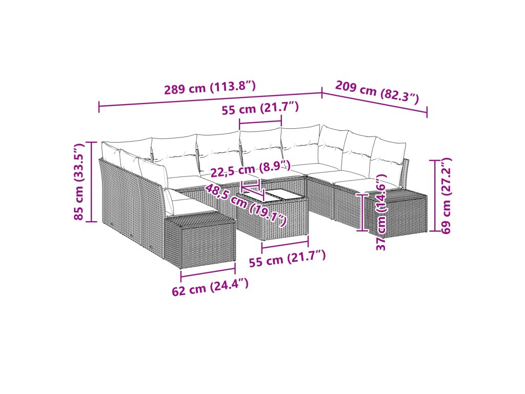 Tahle souprava má úžasný matný černý povrch, který se snadno nevybledne, takže dlouho vypadá skvěle. Modulární design ti umožní přizpůsobit uspořádání podle potřeby, což se hodí pro jakoukoli venkovní scénu nebo akci. Vyrobeno z odolného poly ratanu a měkkých polštářů, které kladou důraz na pohodlí a styl. Elegantní stůl je ideální na nápoje a pochutiny, což tvé venkovní akce posune na další úroveň. A navíc jsou polštáře odolné vůči povětrnostním vlivům, takže si můžeš užívat příjemné sezení.- Počet kusů: 10