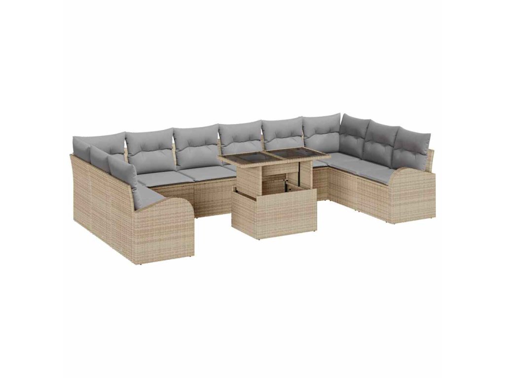 Tato sada zahradní pohovky se 11 kusy kombinuje stylový design a praktické využití, ideální pro vytvoření příjemné atmosféry venku. S moderním vzhledem, co spojuje béžový poly ratanový rám s šedými polštáři, nejen že ozdobí tvůj balkon nebo terasu, ale nabídne taky spoustu pohodlného sezení pro rodinu a kámoše.
