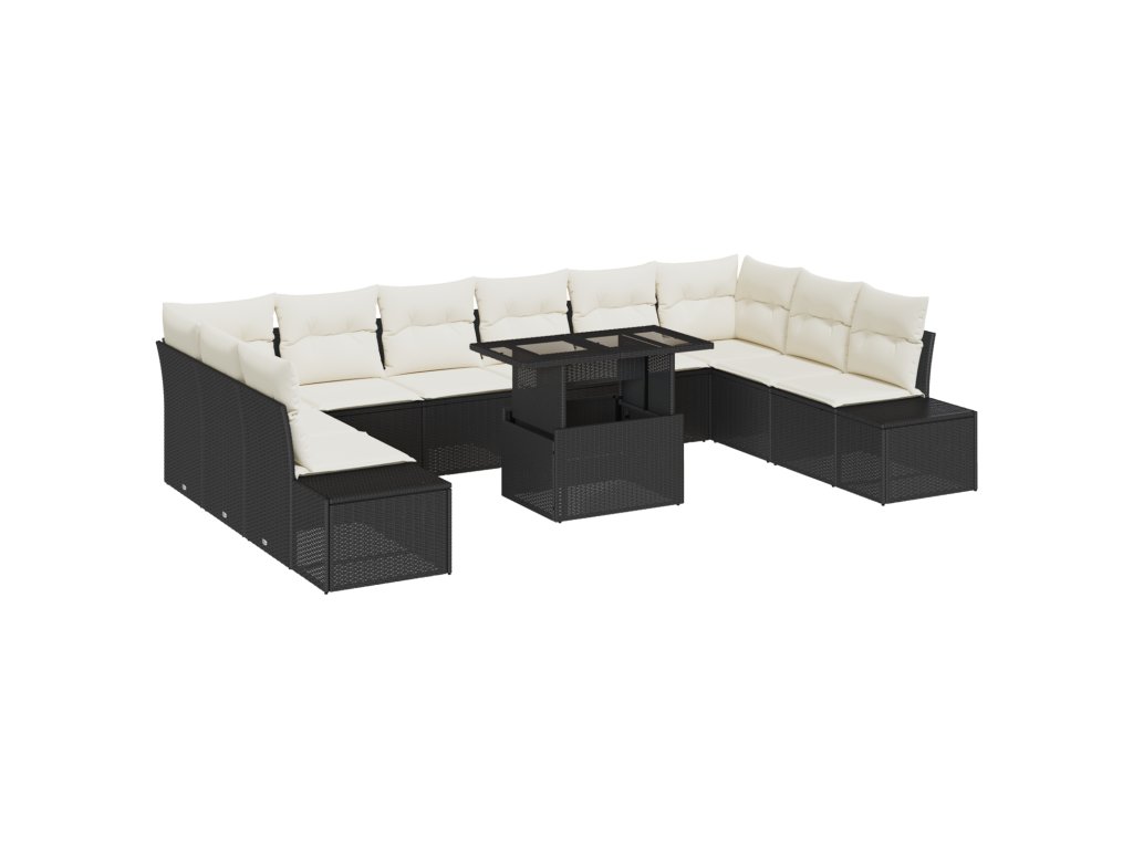 Tato 11-dílná sada venkovních pohovek je ideální pro setkání ve tvých venkovních prostorách. Vyrábí se z kvalitního poly ratanu, vypadá skvěle a pohodlně pojme až 10 lidí, takže se hodí na terasy, zahrady nebo balkony. Stylový černý povrch a béžové polštáře vytvářejí příjemnou atmosféru pro relaxaci nebo setkání s přáteli.